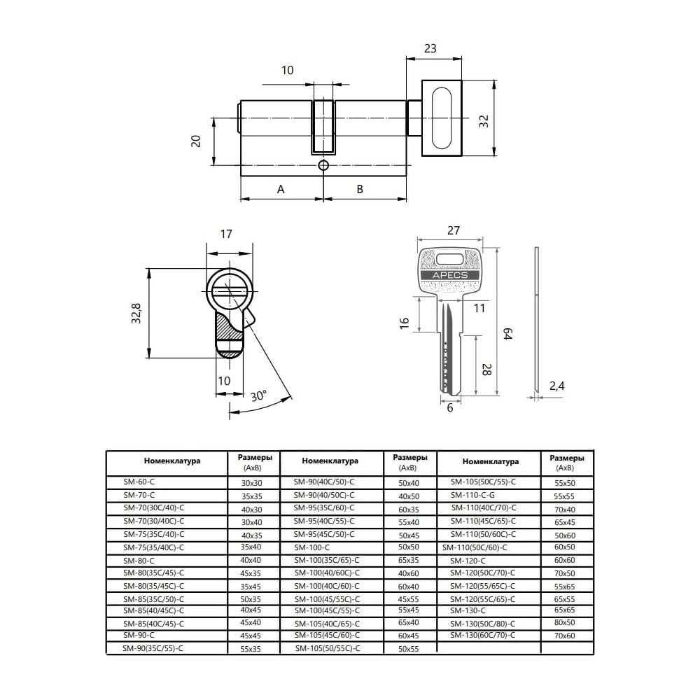 Цилиндровый механизм APECS SM-100/40C/60/-C-NI 23179