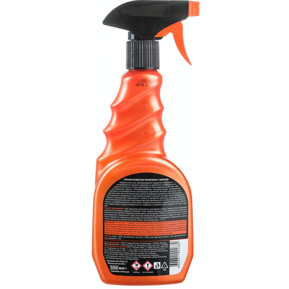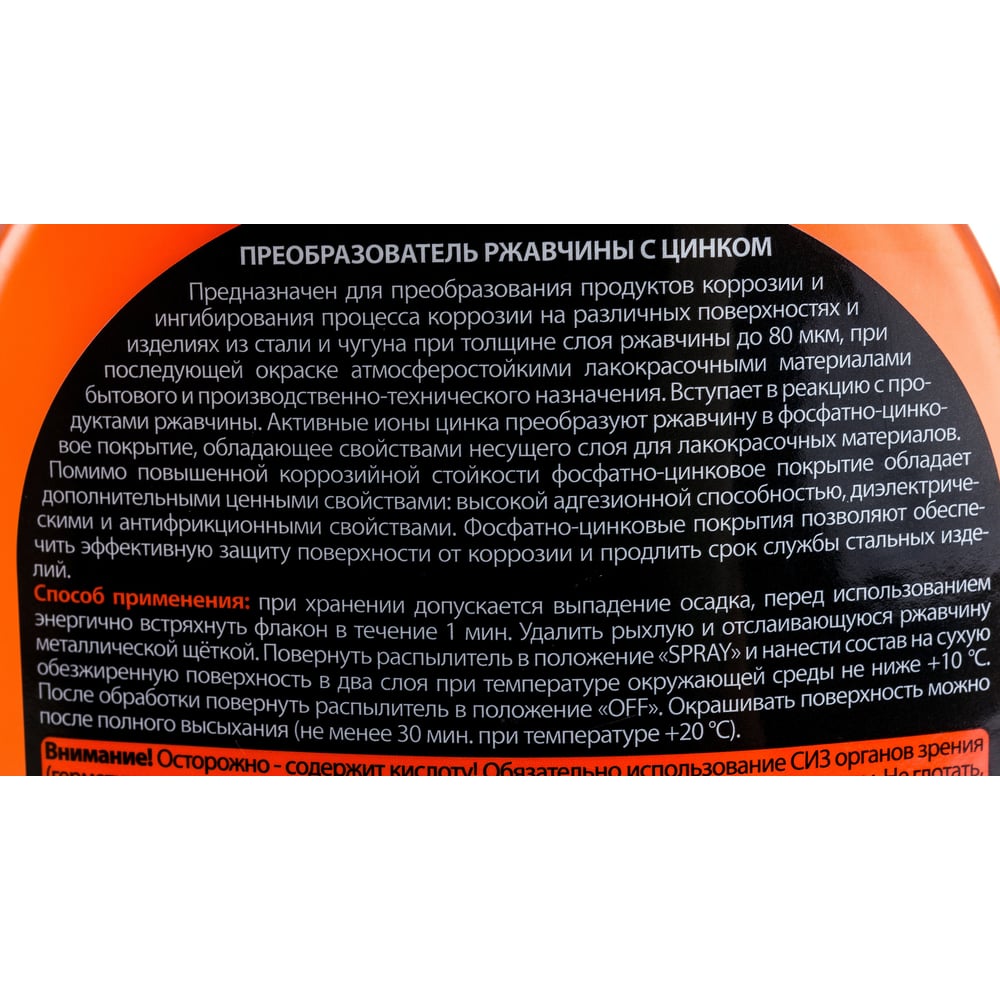 Объем 0.5 л Вид преобразователь ржавчины Вес нетто 0.57 кг Состав вода >30%, фосфорная кислота >30%, монофосфат цинка <5%, функциональные добавки <5%. Вид тары бутыль с распылителем Марка нет Уровень рН 0 Кислотный есть С цинком да