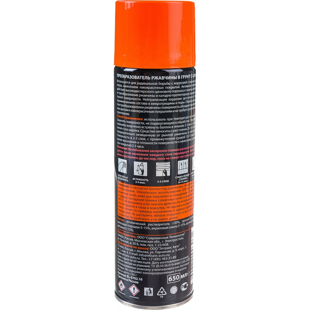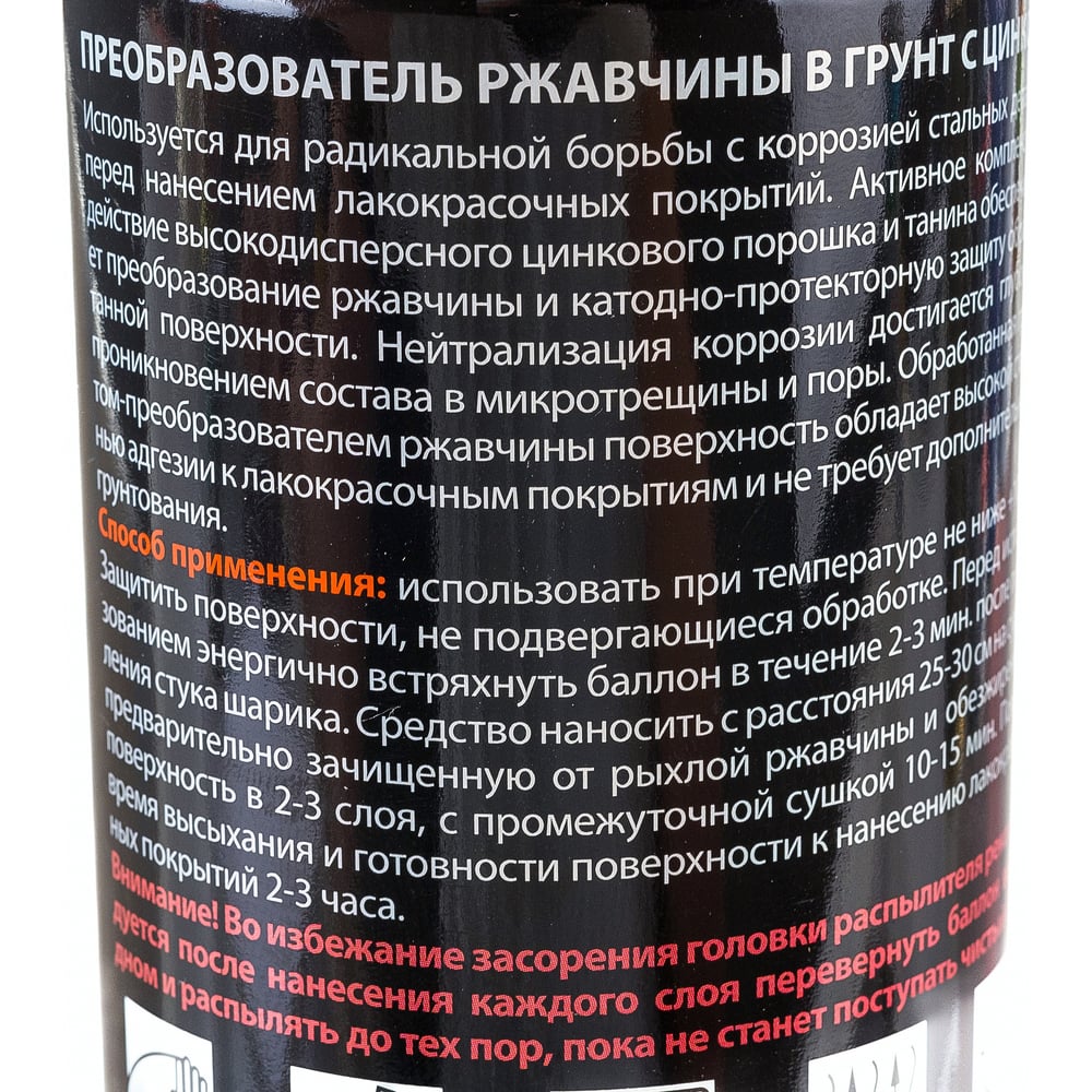 Объем 0.65 л Вид преобразователь ржавчины Вес нетто 0.33 кг Состав органический растворитель >30%, пропан-бутан >30%, танин 5-15%, акриловая смола <5%. Вид тары баллон Марка нет Уровень рН 0 С цинком да