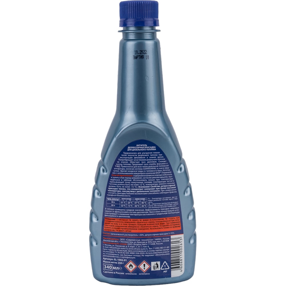 Антигель для дизельного топлива ELTRANS концентрат на 30-60 л ПЭТ флакон, 340 мл EL-1002.01