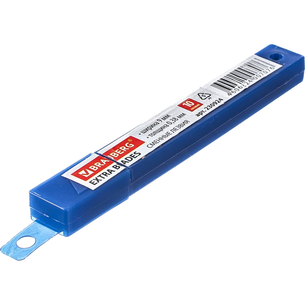 Лезвия для ножей 9 мм, BRAUBERG КОМПЛЕКТ 10 шт, толщина лезвия 0,38 мм, в пластиковом пенале, 230924