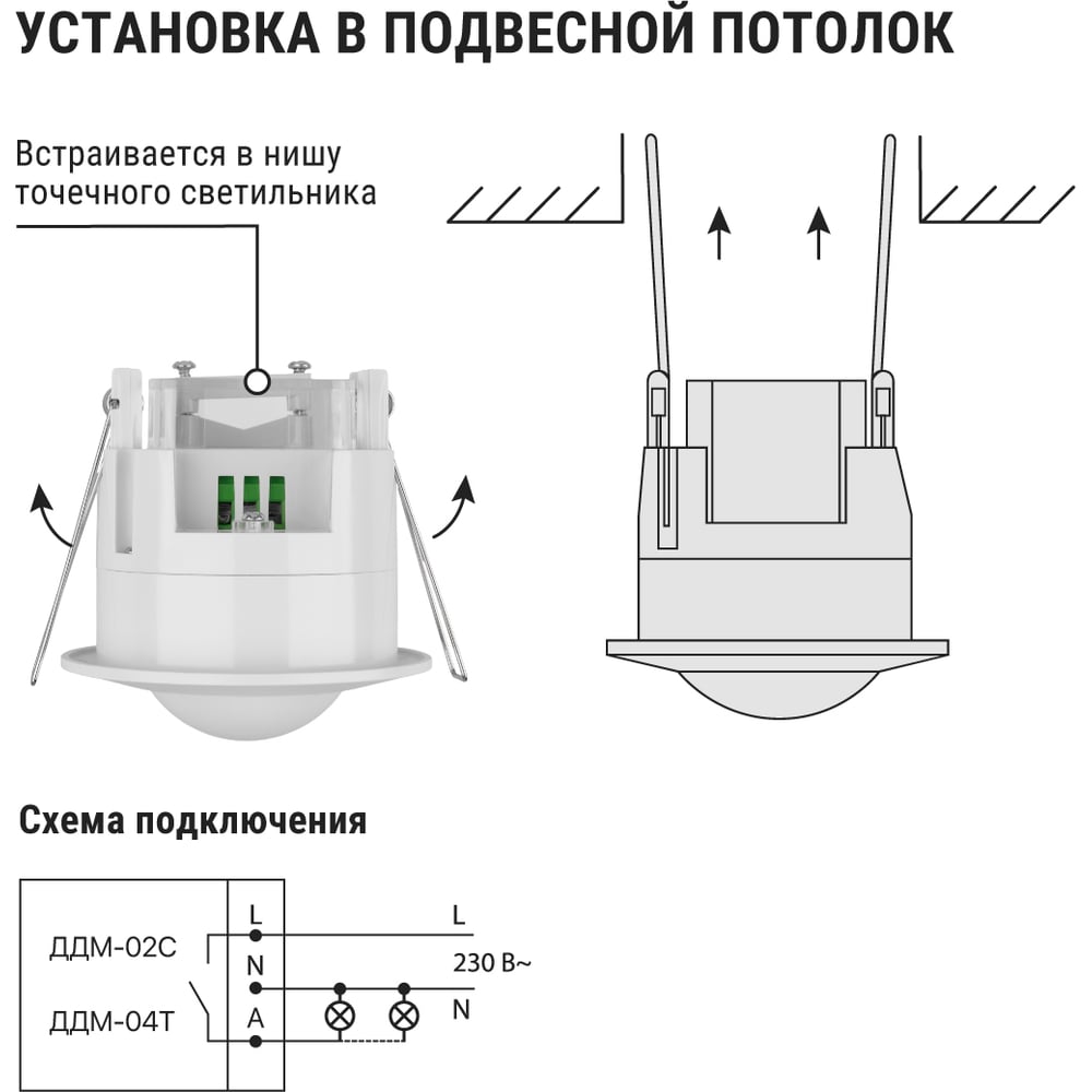 Габариты без упаковки 61х61х75 мм Тип установки точечный Вес нетто 0.15 кг Цвет корпуса белый ГОСТ нет Напряжение 230 В Модельный ряд ДДМ Монтаж встраиваемый Уличный нет Светодиодный индикатор да Таймер да Элементы питания сеть Рабочая температура от -20 до +40 °С Max угол обзора 360 град Степень защиты корпуса 20 IP Wi-Fi нет Max мощность нагрузки 1200 Вт Фотореле нет Звуковой сигнал нет Возможность угловой установки нет Задержка времени выключения 10 сек-12 мин Дальность действия 8 м Рекомендуемая высота установки 1.5 м Max задержка выключения/отключения 12 мин Подключение трехпроводной Принцип действия микроволновой Виды режимов LUX/TIME/SENS