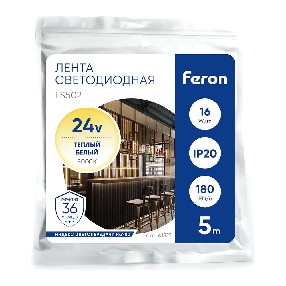 Светодиодная лента FERON LS502/ 180SMD 2835 /м 16Вт/м 24V 5000х10х1.22мм 3000К 41527