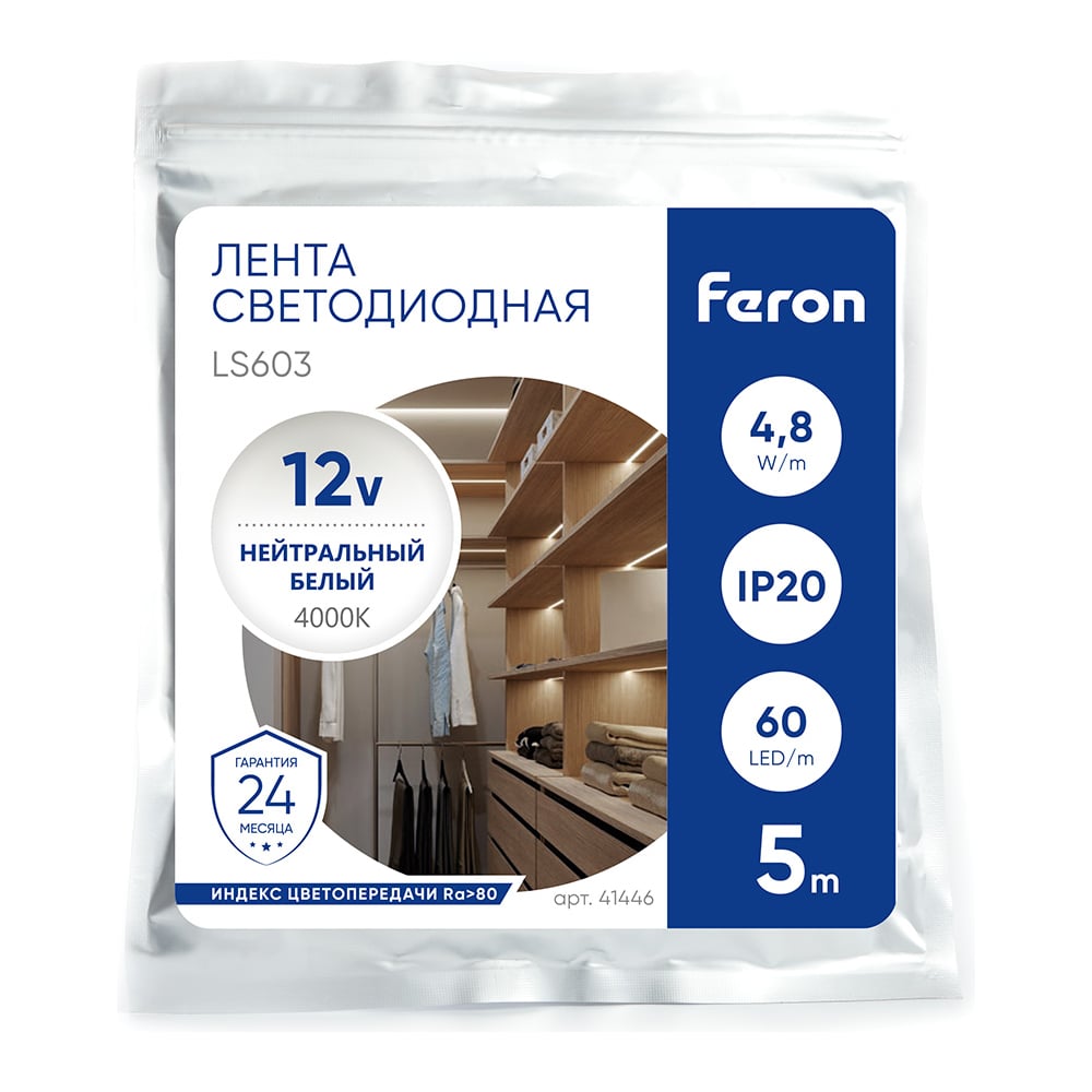 Светодиодная лента FERON LS603 60SMD 2835 /м 4.8Вт/м 12V 5000х8х1.22мм 4000К 41446