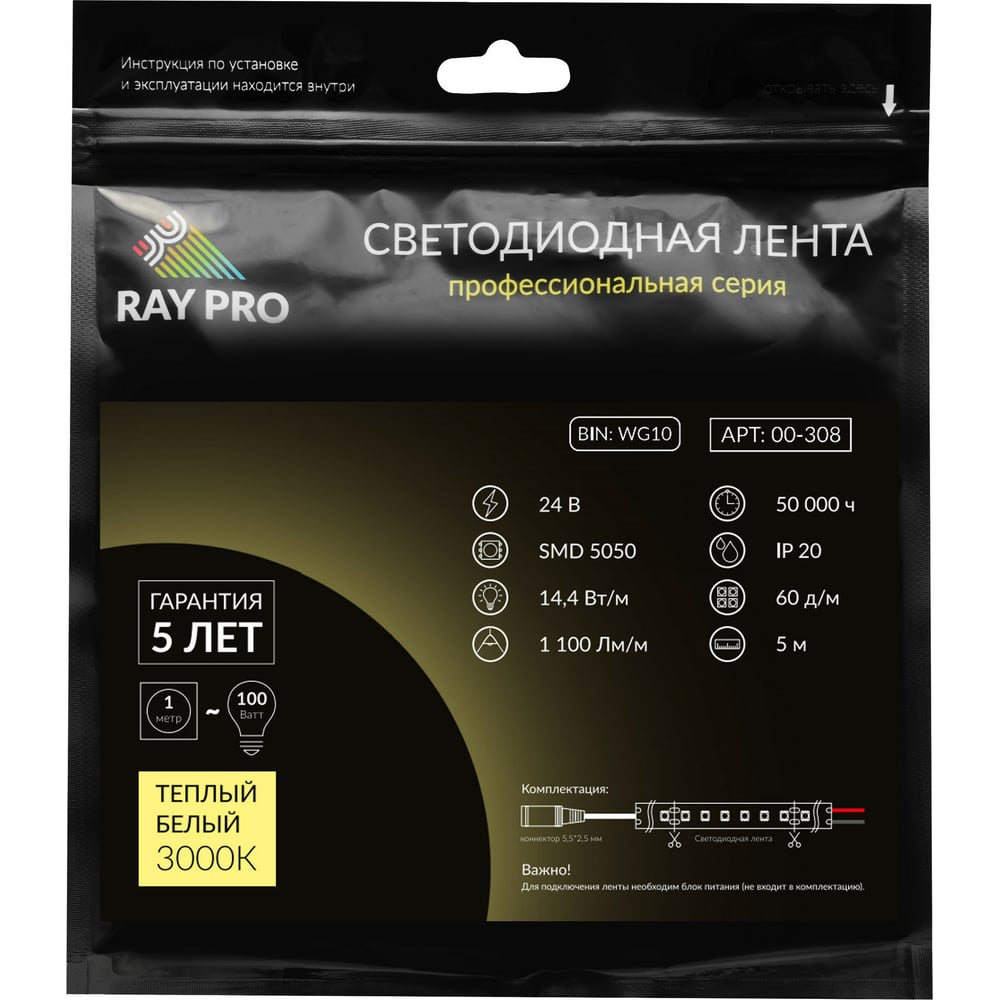 Светодиодная лента Apeyron 24В, 14,4Вт/м, smd5050, 60д/м, IP20, 1100Лм/м подложка 10мм, 5м, 3000К 00-308