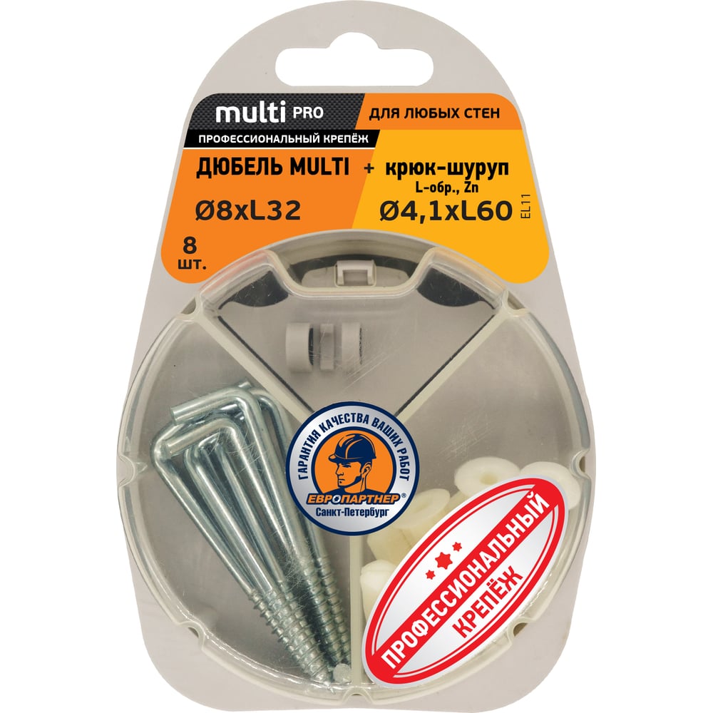 Дюбель ЕВРОПАРТНЕР MULTI 8 + крюк-шуруп, L-образный, d4,1 х L60 ZN 8 шт. RB2 0159