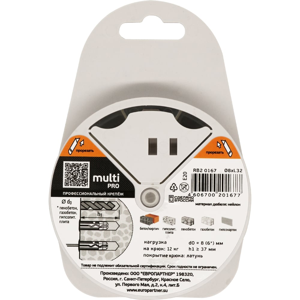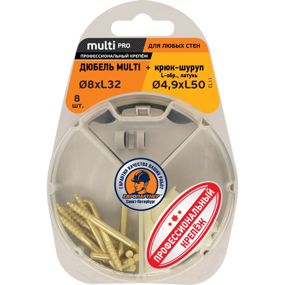 Дюбель ЕВРОПАРТНЕР MULTI 8 + крюк-шуруп, L-образный, d4,9 х L50, латунный, 8 шт. RB2 0167