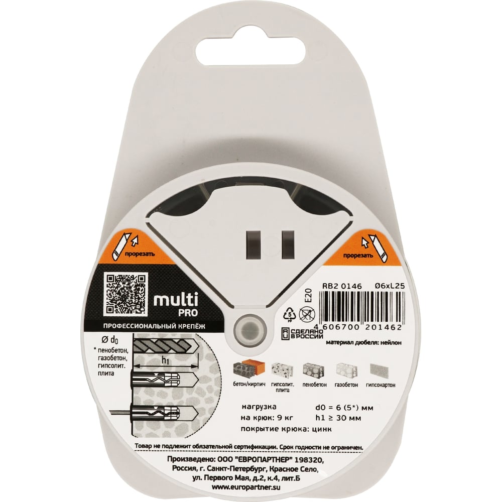 Дюбель ЕВРОПАРТНЕР MULTI 6 + крюк-шуруп, d3,8 х L40 белый, 10 шт. RB2 0152