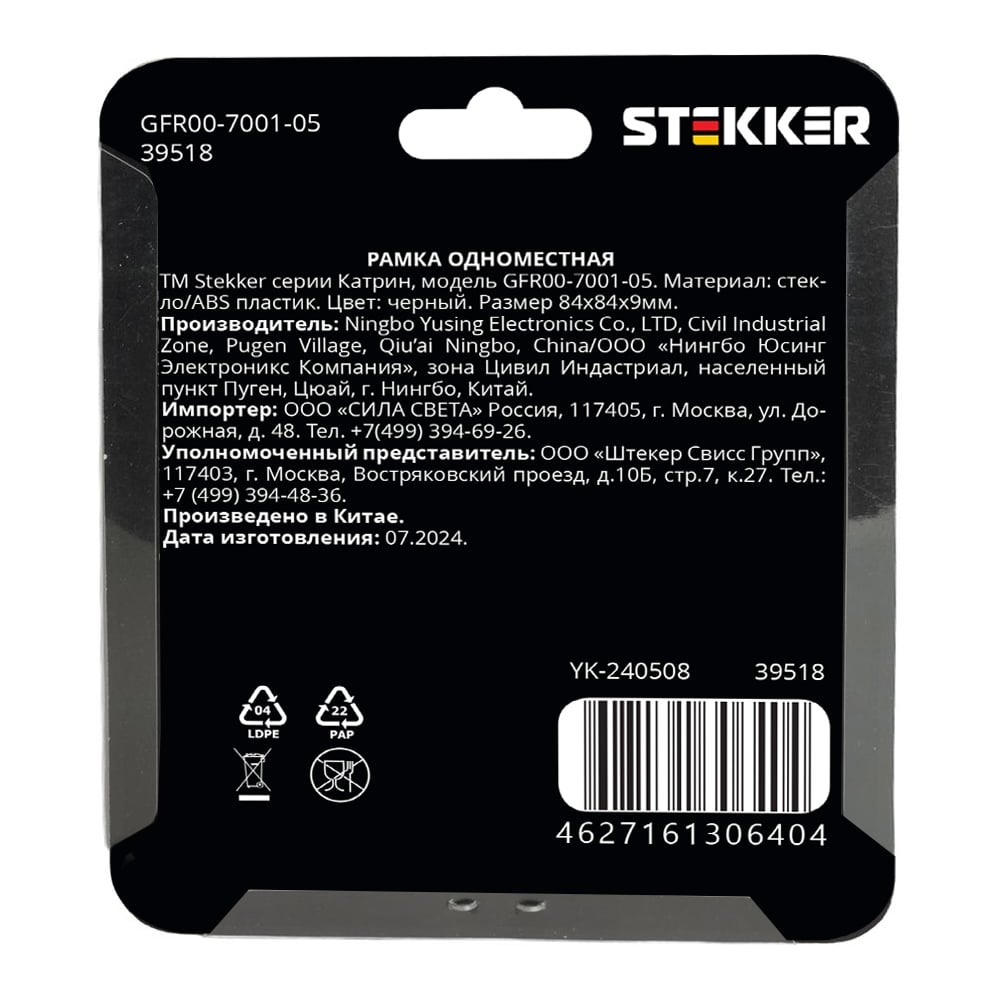 1-местная рамка STEKKER GFR00-7001-05, серия Катрин, стеклянная, черный 39518