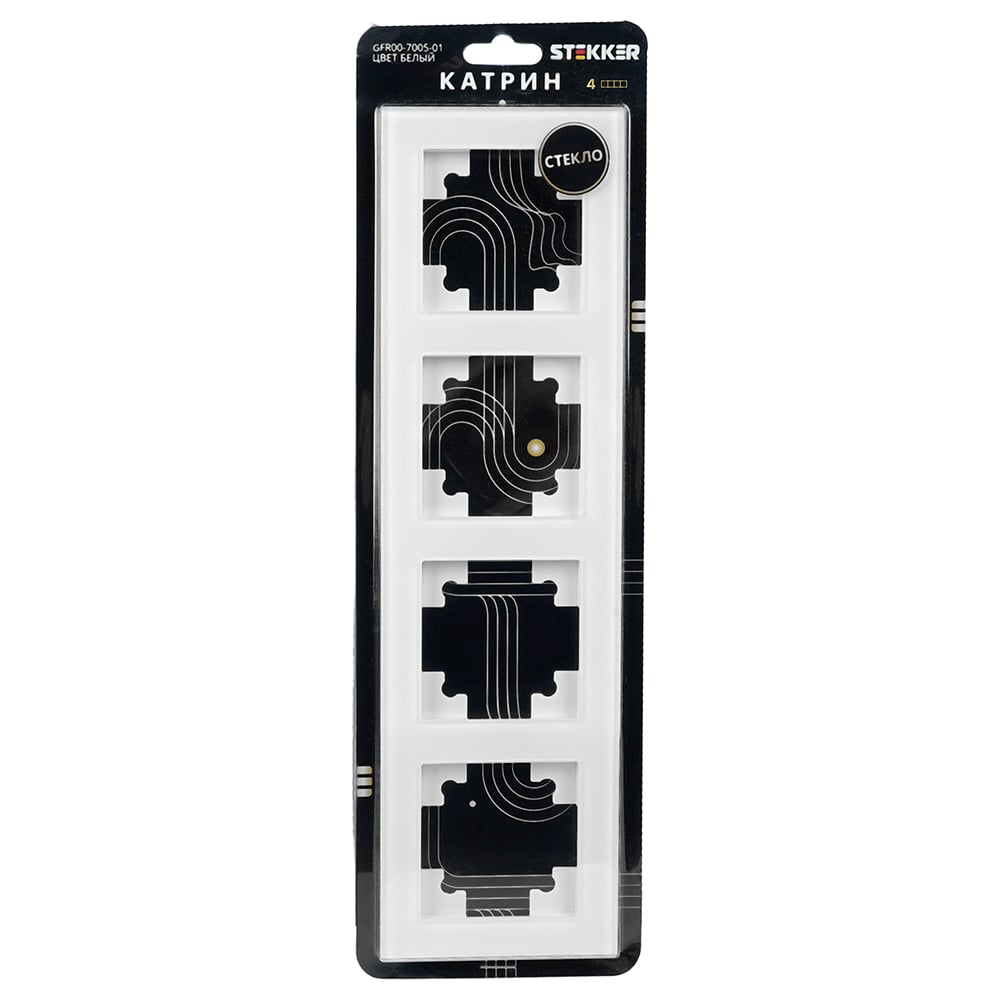 Материал закаленное стекло/АБС-пластик Цвет белый Вид рамка Серия Катрин Степень защиты IP20 Модульная нет Палитра белый Крышка нет Количество постов 4 Ширина устройства 295 мм Высота устройства 84 мм Глубина устройства 9 мм Для кабель-каналов нет Перегородка есть