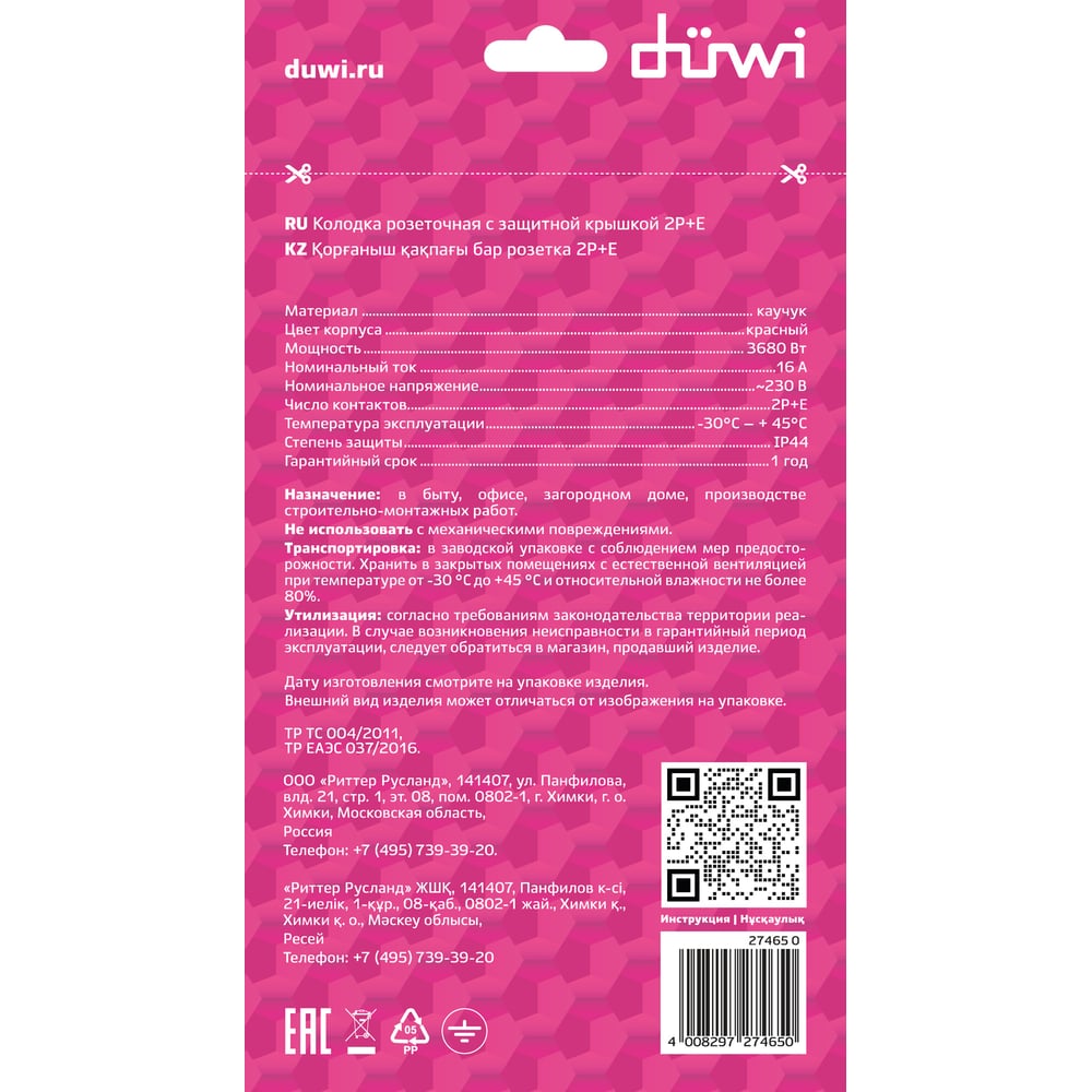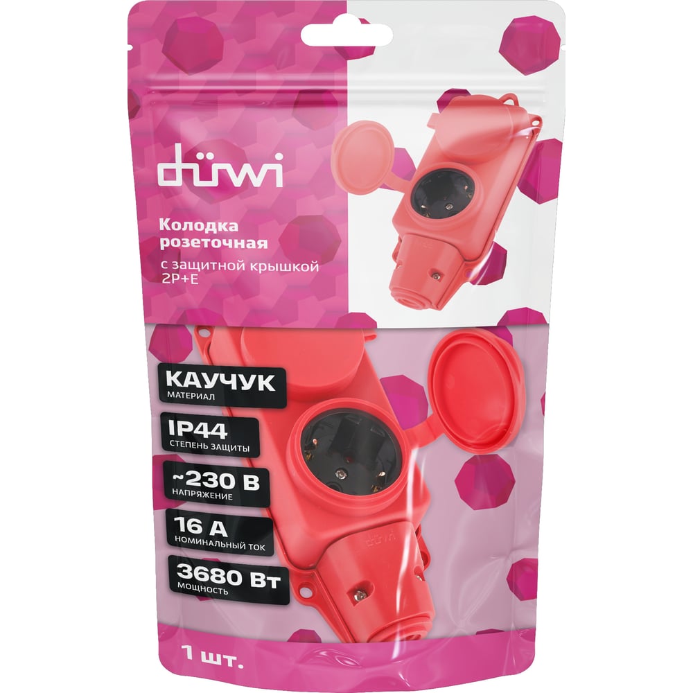 Каучуковая колодка duwi с крышкой с заземлением 2 гнезда 16A IP44 красная 27465 0