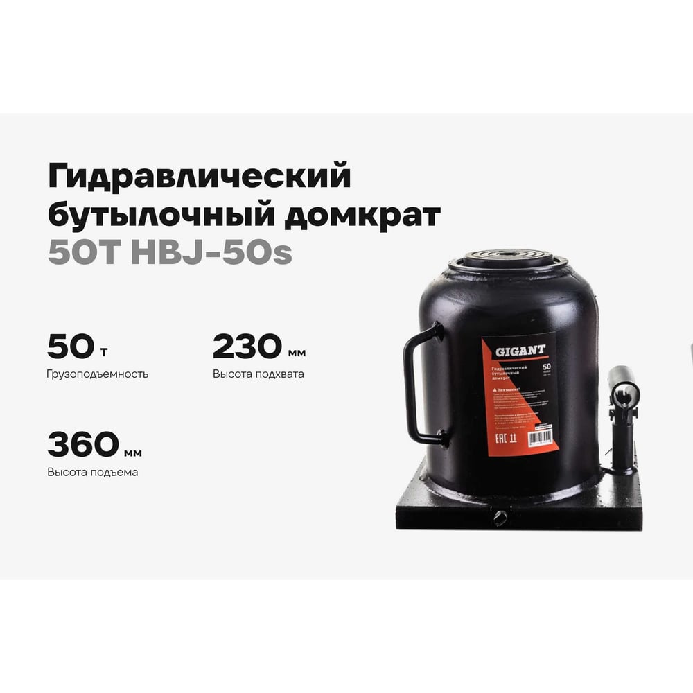 Гидравлический бутылочный домкрат Gigant 50Т, подхват 230мм, подъем 360мм, рабочий ход 130мм, HBJ-50s