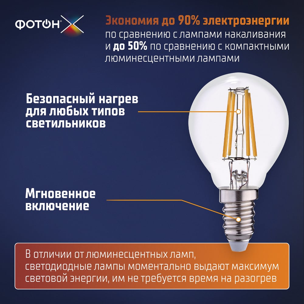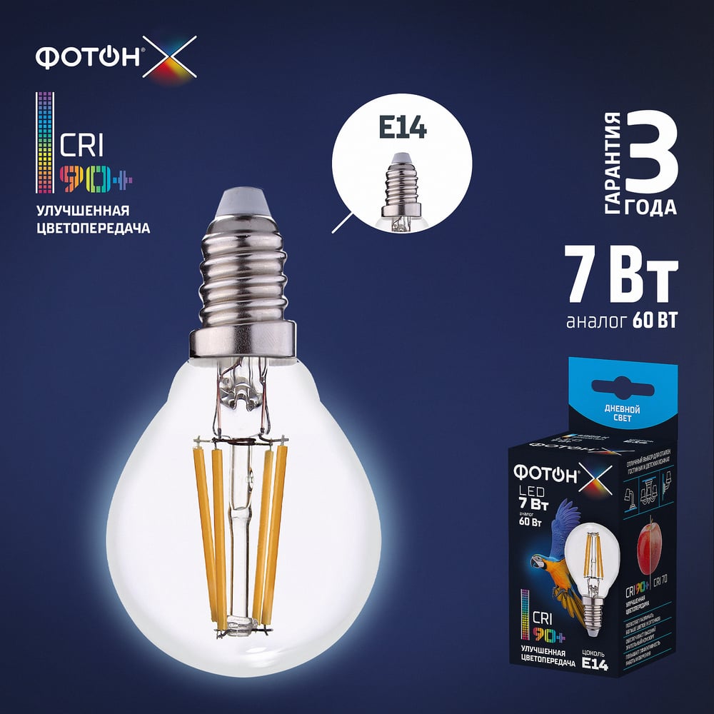 Светодиодная лампа ФОТОН филаментная LED FL P45-C 7Вт E14 4000K, белый свет, 24001