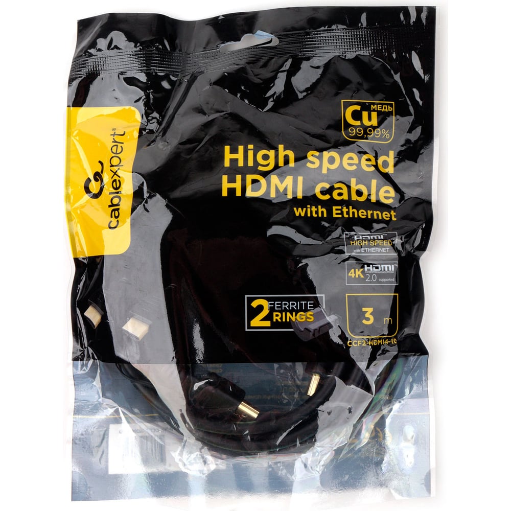 Кабель HDMI Cablexpert 3м v2.0 19M/19M медь, черный позолоченные разъемы экран 2 ферритовых кольца пакет CCF2-HDMI4-10
