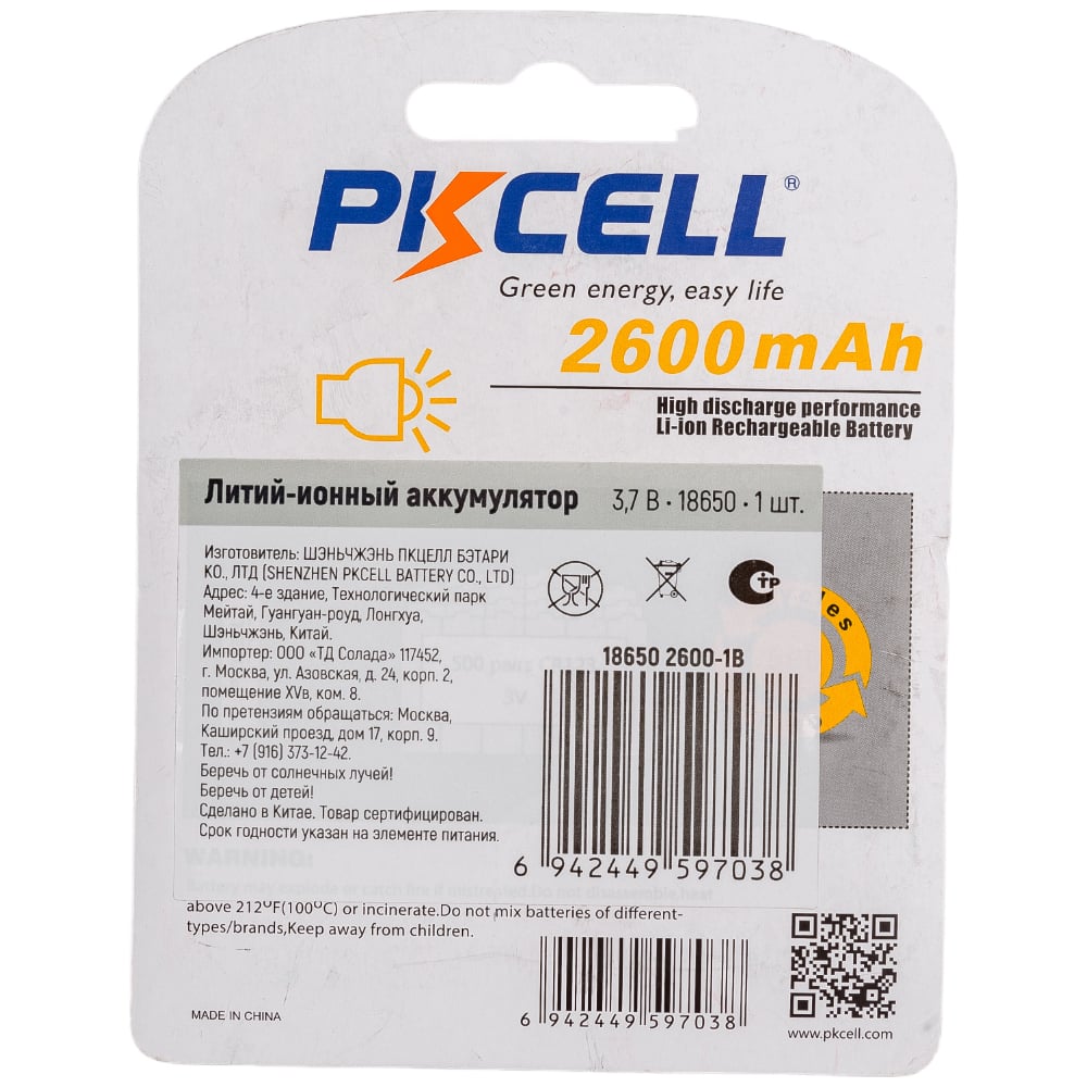Литий-ионный аккумулятор PKCELL тип - 18650 1 шт в блистере, без защиты 18650 2600-1B