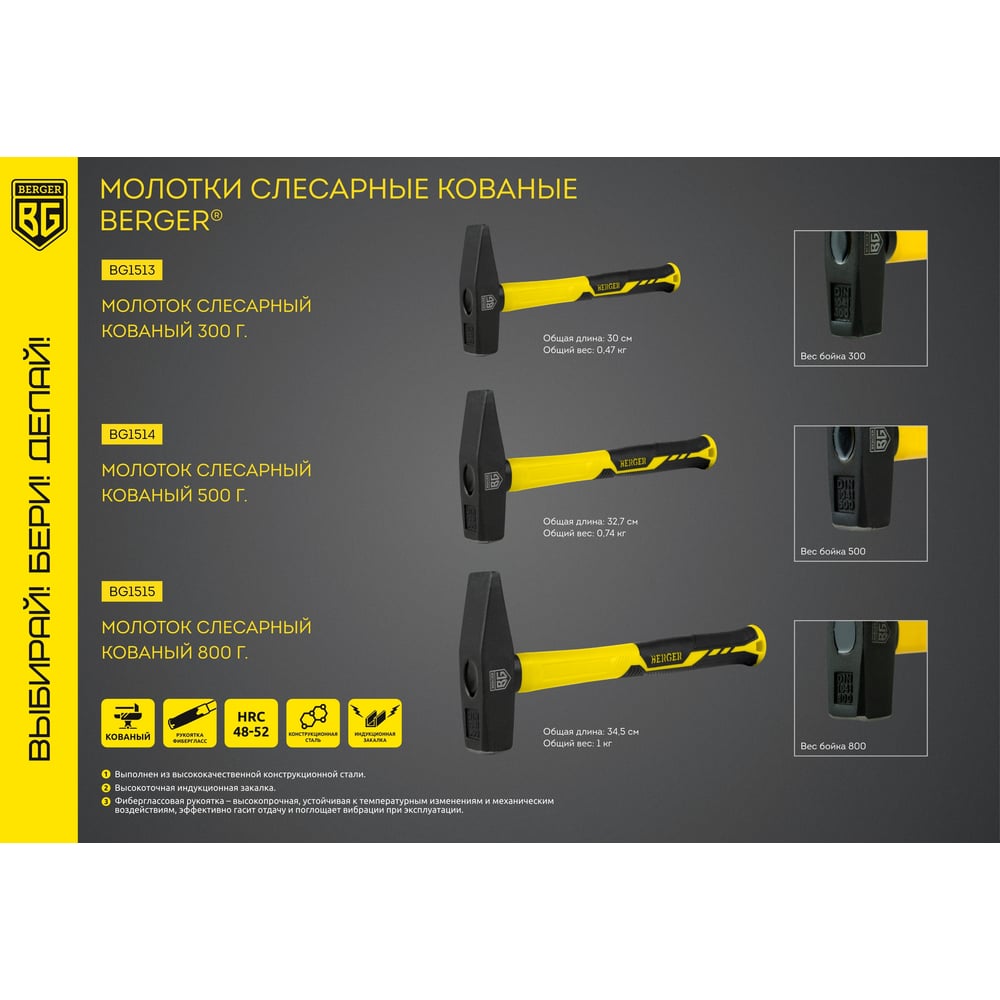 Слесарный молоток Berger BG кованый, фиберглассовая рукоятка, 500 г BG1514