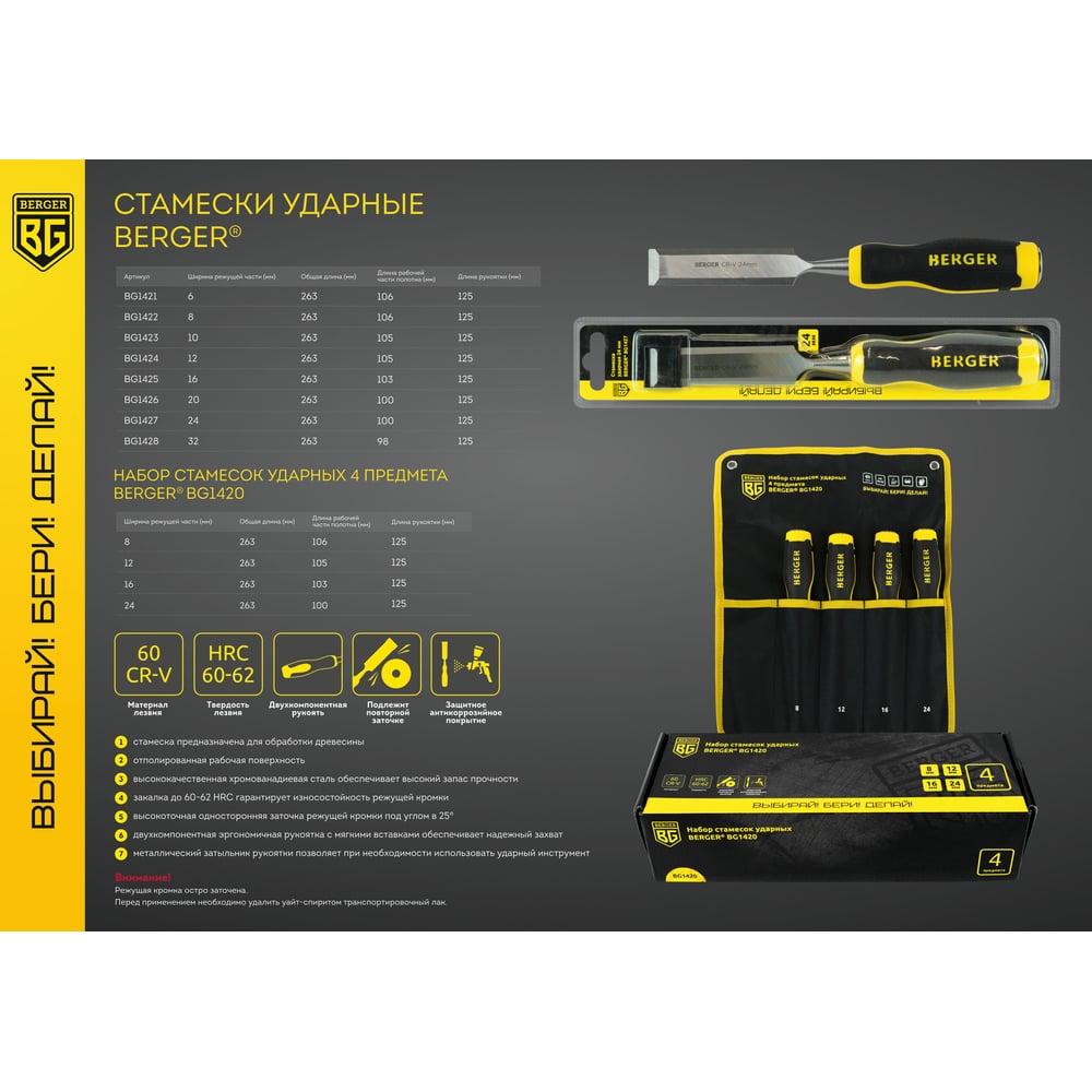 Набор ударных стамесок Berger BG 4 предмета 8, 12, 16, 24 мм BG1420