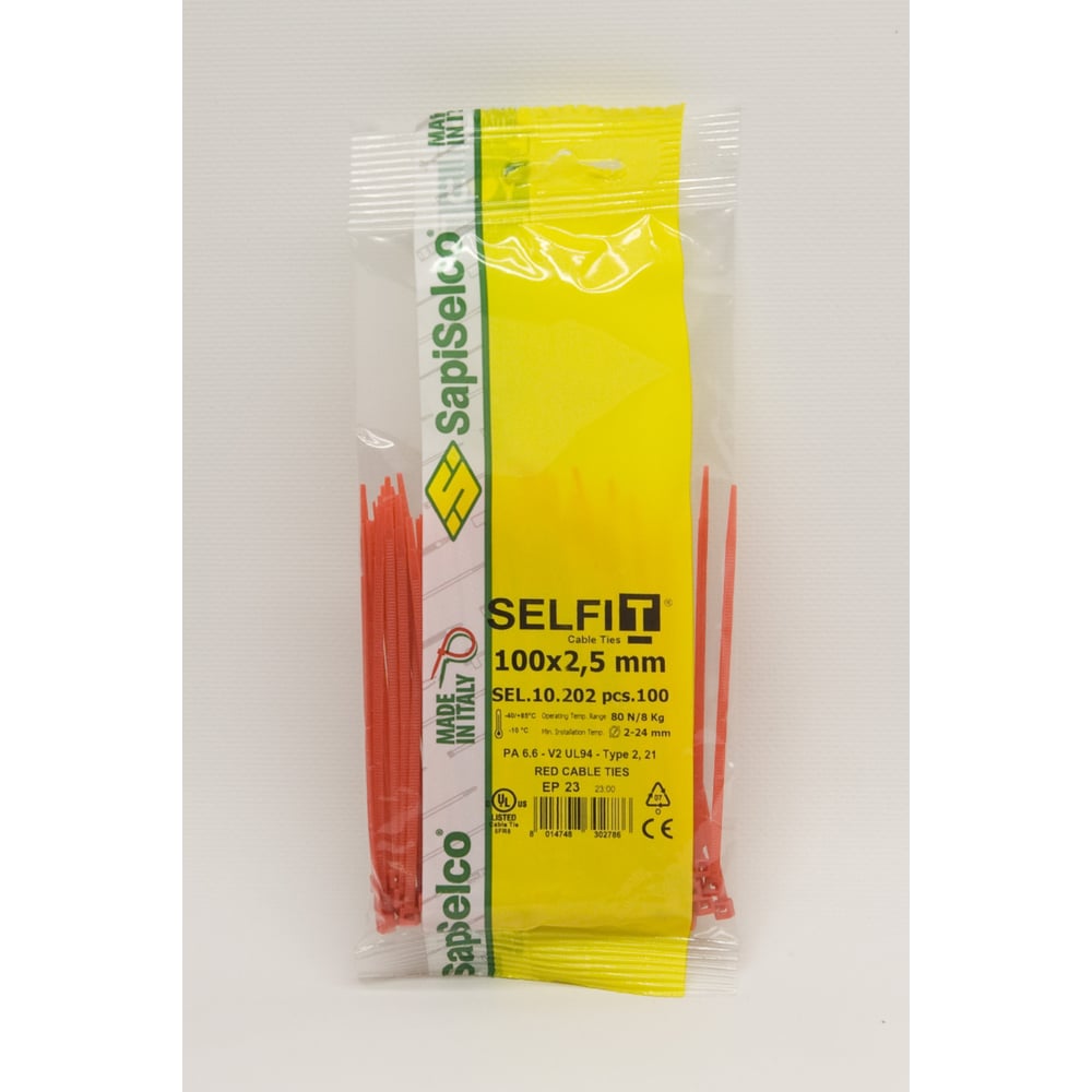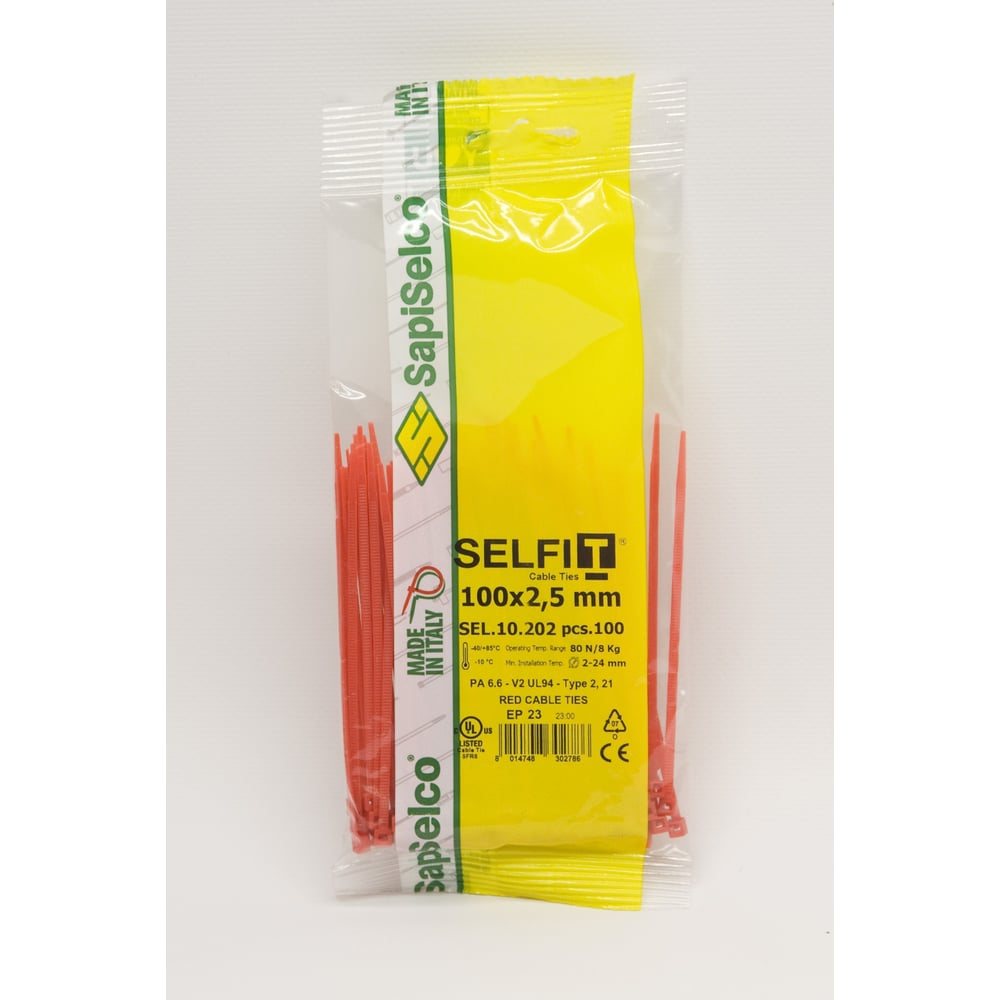 Стяжки SapiSelco красного цвета, 2.5x100 мм, полиамид 6.6, уп. 100 шт. SEL.10.202R