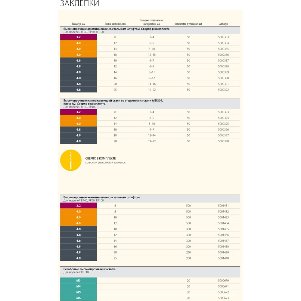 | Тип заклепок | резьбовые |