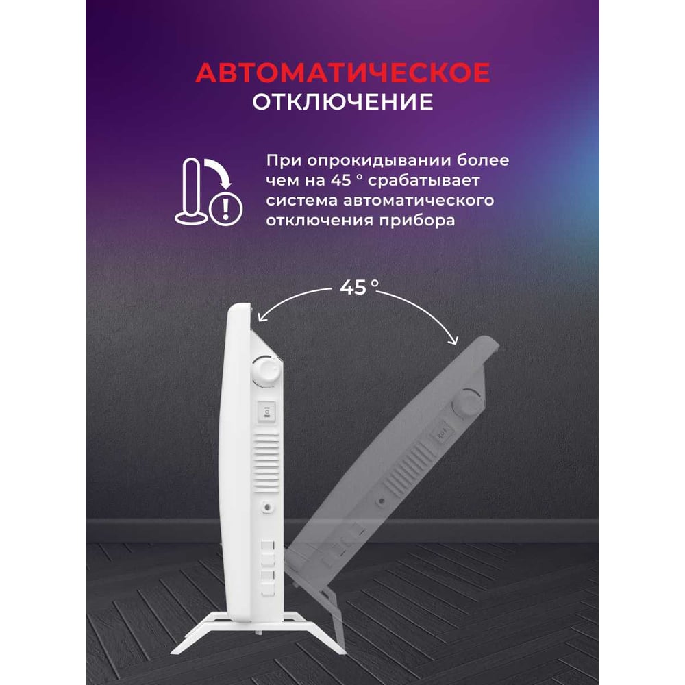 Габариты без упаковки 460х400х83 мм Высота 400 мм Ширина 460 мм Цвет белый Вес нетто 3.3 кг Материал корпуса металл Вид крепления настенный/напольный Серия RIBERA MECCANICO Степень защиты IP24 Напряжение 220 В Глубина 83 мм Световая индикация нет Заземление есть Дисплей нет Рекомендуемая площадь 10 м² Max мощность 1 кВт Наличие сетевой вилки есть Поддержка Wi-fi нет Защита от перегрева да Встроенный вентилятор нет Инверторная технология нет Вид термостата механический Ножки в комплекте есть Тип нагревательного элемента монолит (х-образный) Длина шнура 1.5 м Количество режимов мощности 2 шт Для системы Умный дом нет Ступени мощности 0.5/1 кВт Пульт ДУ в комплекте нет Антизамерзание да