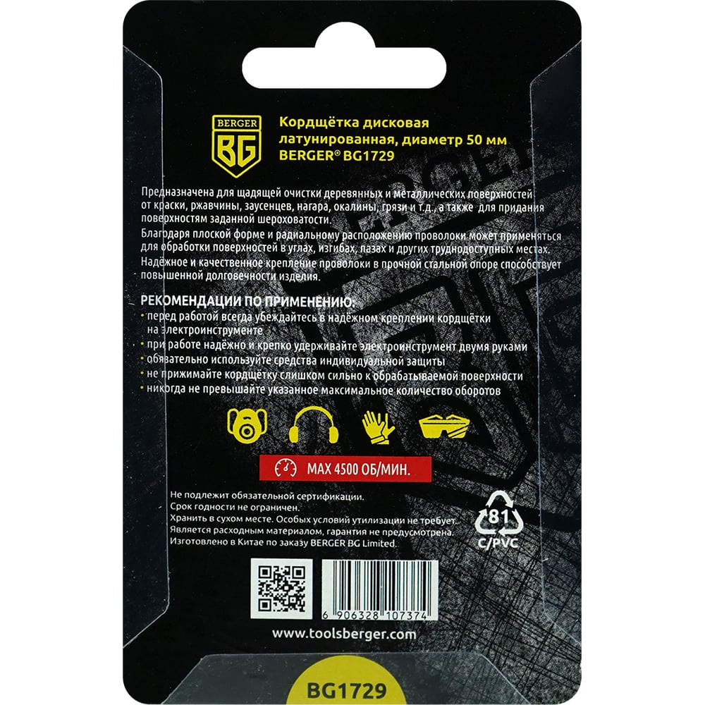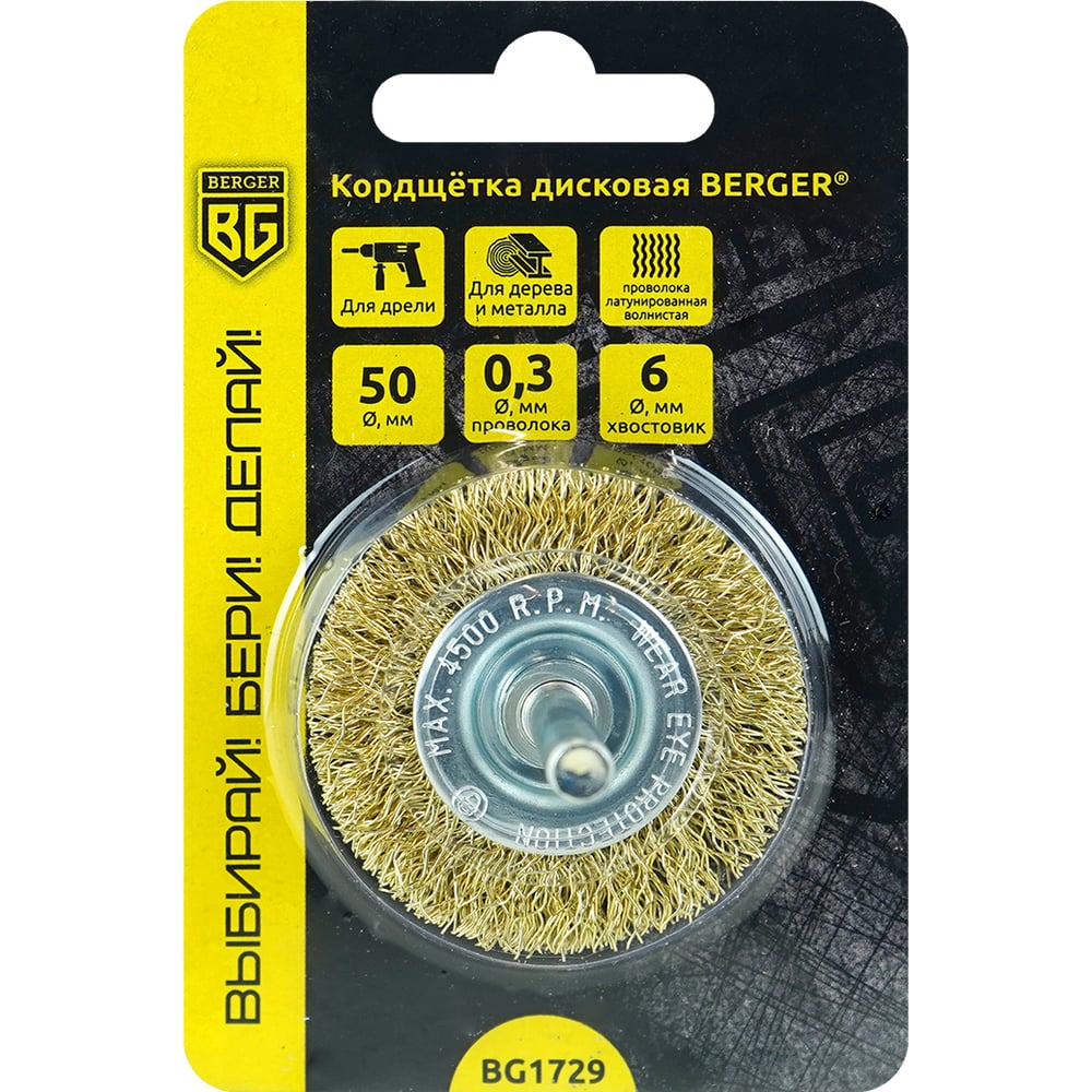 Кордщётка дисковая 50 мм, латунированная сталь 0.3 мм, хвостовик 6 мм Berger BG BG1729