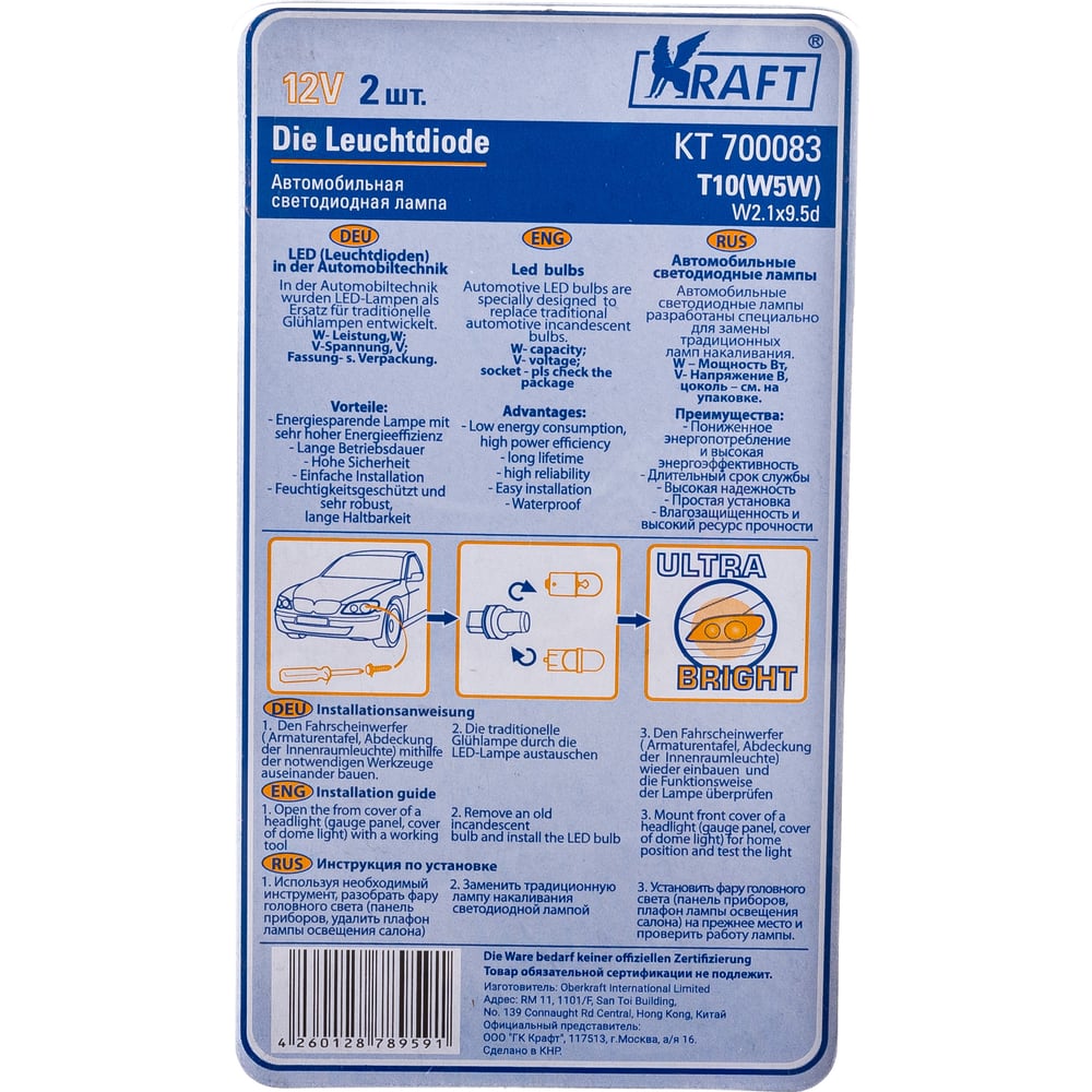 Светодиодная лампа KRAFT T10 W5W W2.1x9.5d 12v blue KT 700083