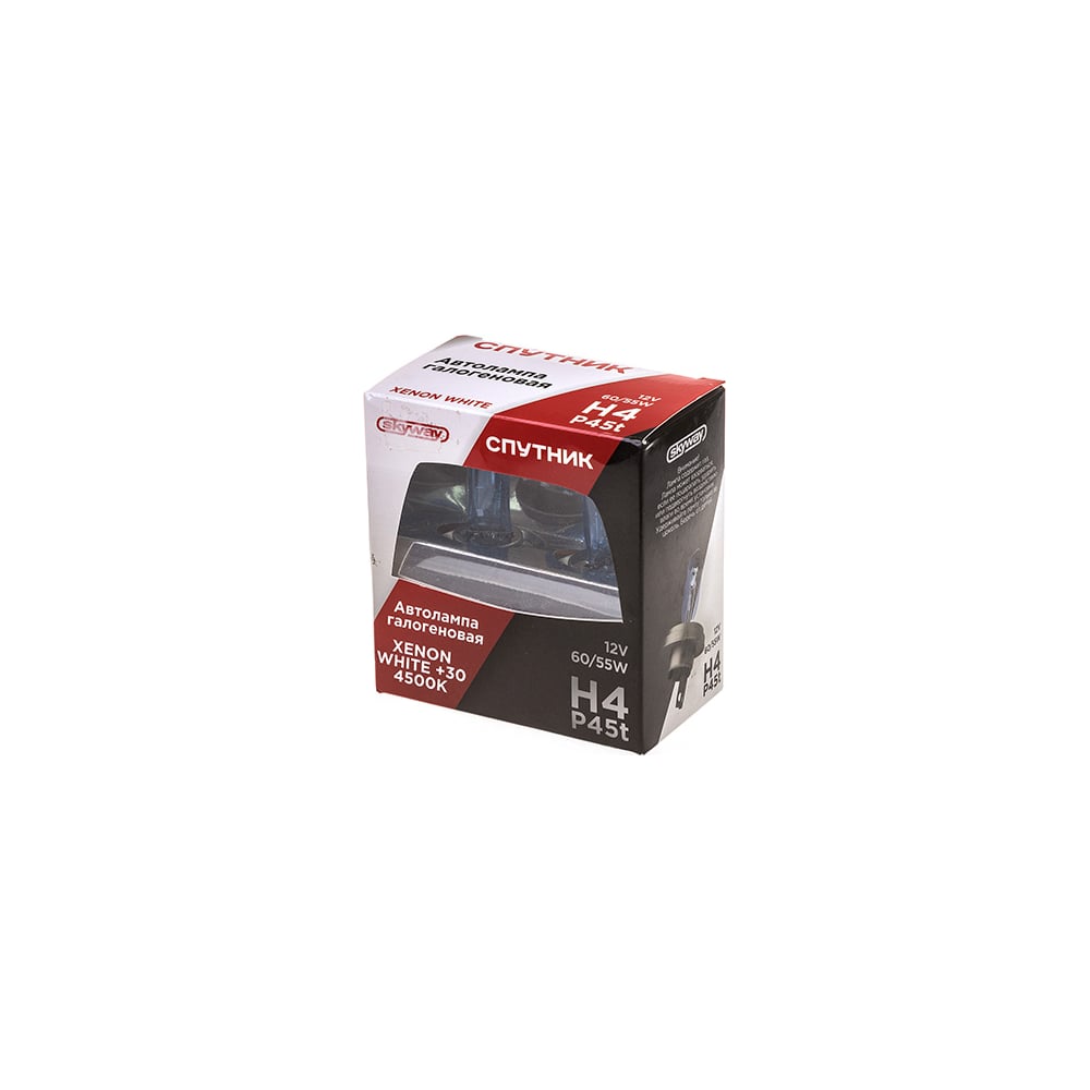 Автолампа SKYWAY H4, 12V, 60/55W, P45t, 2-контакта xenon white+30, 4500К, спутник 2 шт, ближний, дальний S09101042