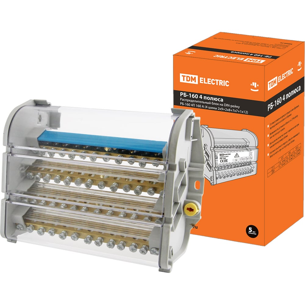 Распределительный блок TDM ELECTRIC на DIN-рейку РБ-160 4П 160А 4 шины 2x9 2x8 7x7 1x12 SQ0823-0007