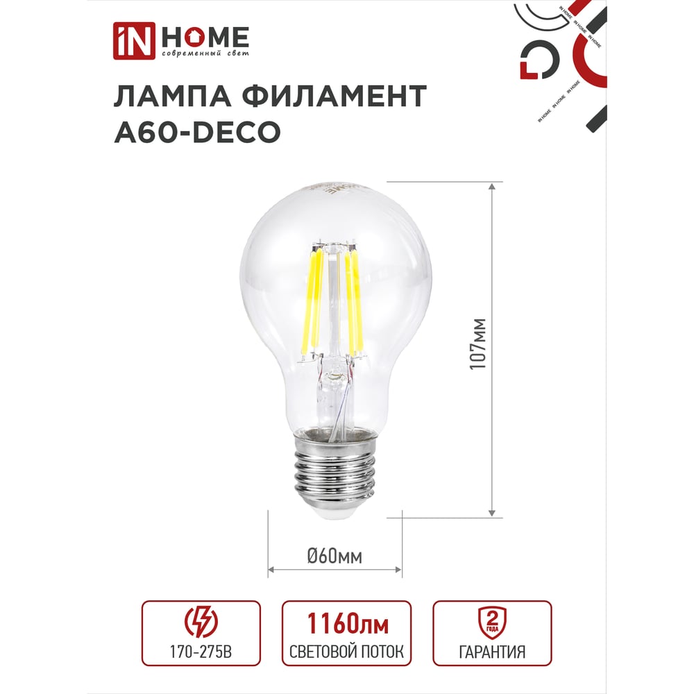 Светодиодная лампа IN HOME LED-A60-deco 11Вт 230В Е27 6500К 1160Лм прозрачная 4690612026169