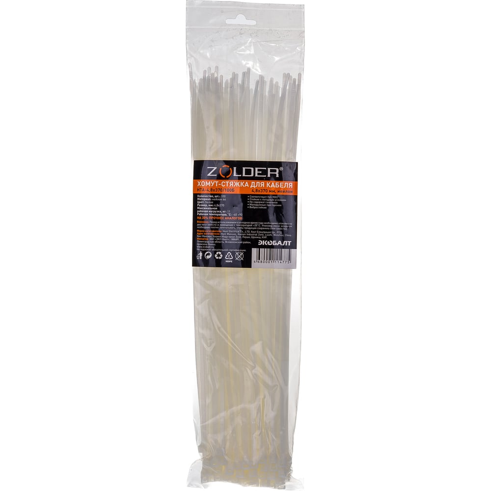 Стяжка для кабеля ZOLDER 370х4,8 мм нейлон, белая, 100 шт. HTA-4,8х370/100Б
