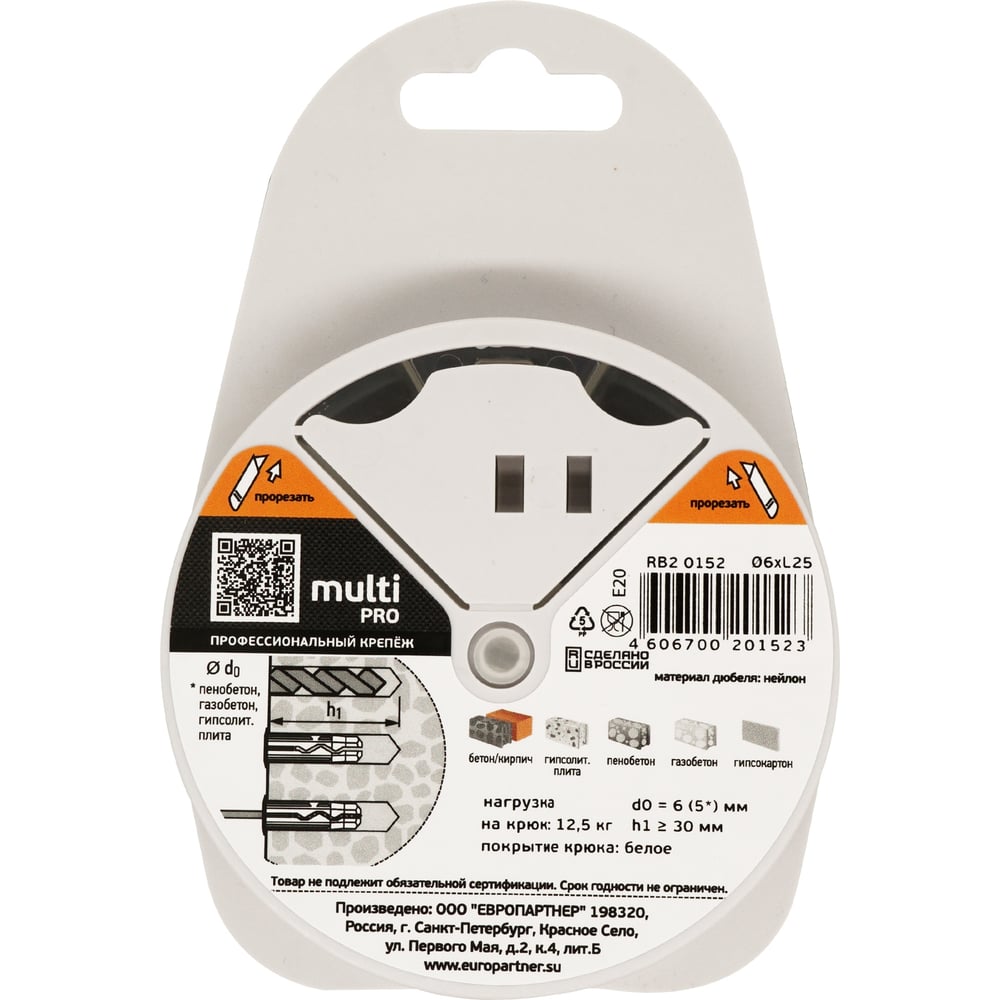 Дюбель ЕВРОПАРТНЕР MULTI 6 + крюк-шуруп, d3,8 х L40 белый, 10 шт. RB2 0152