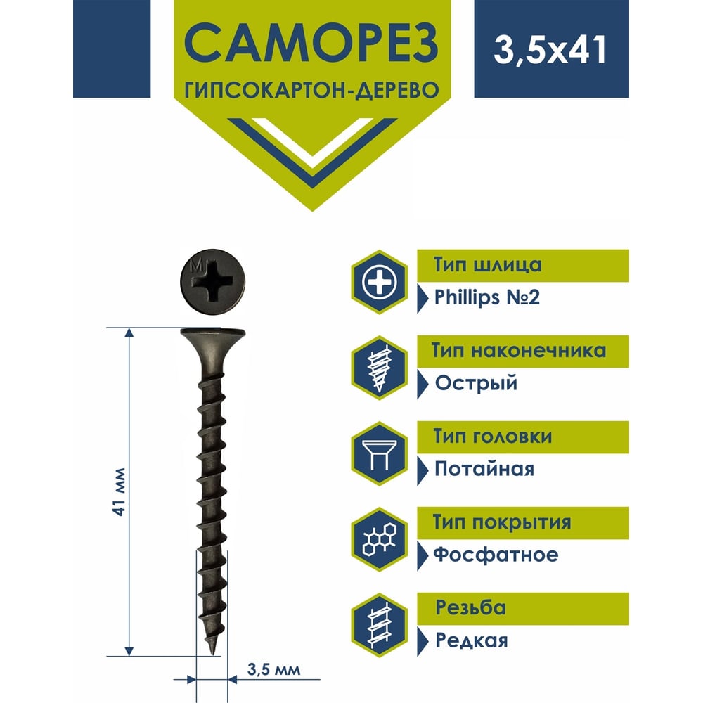 Длина 41 мм Тип резьбы редкая Тип фасовки кг Материал углеродистая сталь Покрытие фосфатированный Диаметр 3.5 мм ГОСТ 59571-2021 Наличие пресс-шайбы нет Нержавеющая сталь нет Цвет покрытия черный Форма головки потайная Размер шлица PH2 Шлиц Phillips (PH) Наконечник острый Полная резьба да Фасовка 1 кг