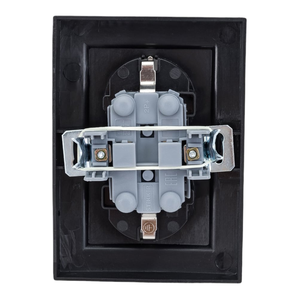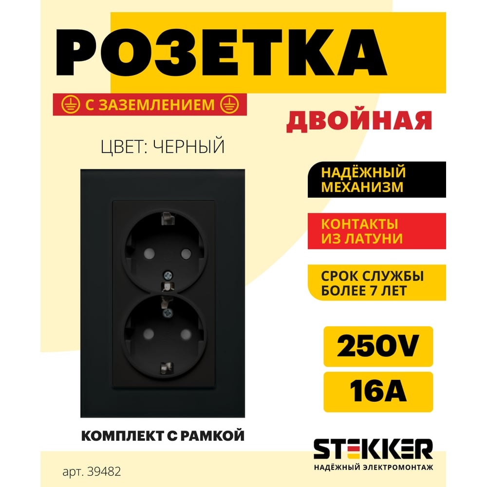 2-местная розетка STEKKER с заземлением PST16-9011-03, с защитной шторкой, 16А, серия Эрна, черный 39482