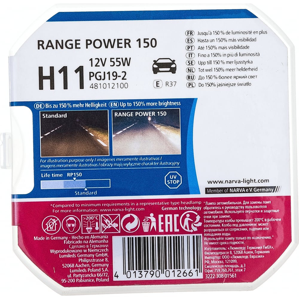 Автолампа H11 55 PGJ19-2+150 RANGE POWER 2шт 12V 1/10 Narva 481012100