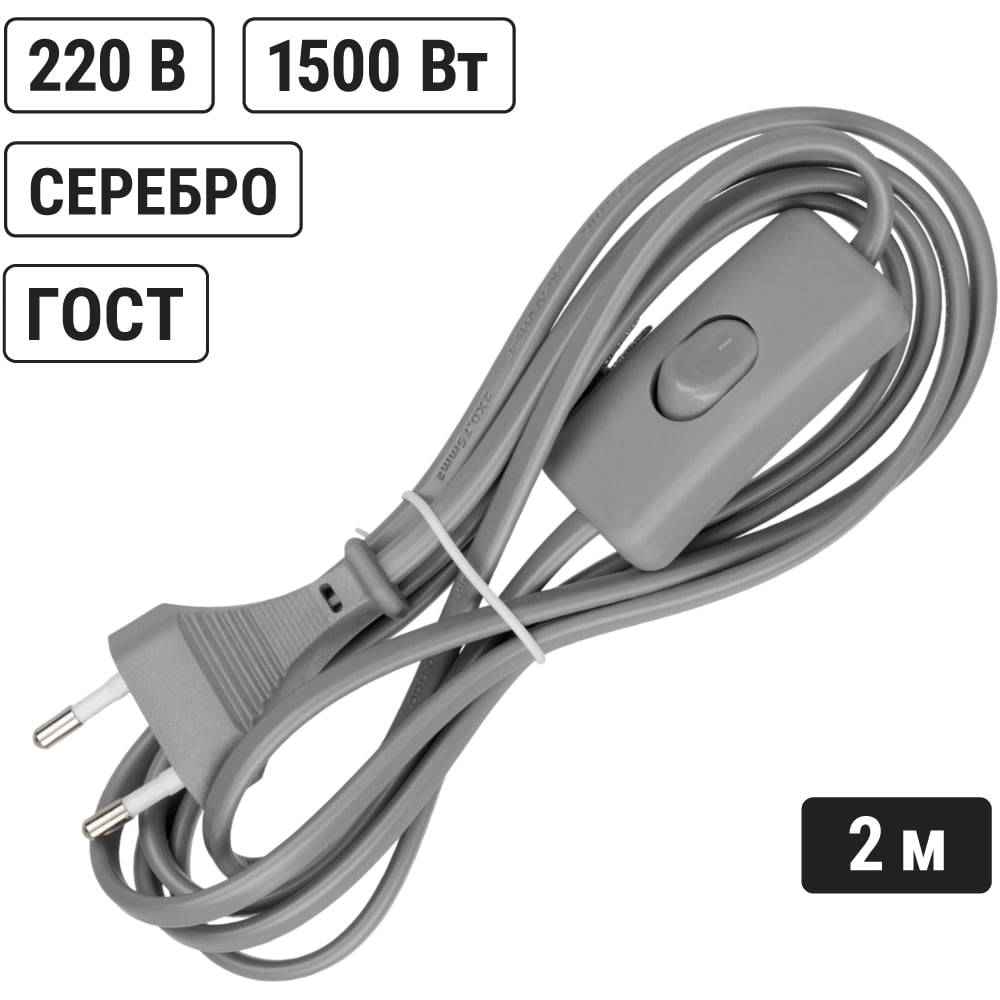 Шнур с выключателем и плоской вилкой TDM ELECTRIC ШУ01В ШВВП 2х0,75мм2 2м. серебр. металлик SQ1305-0005