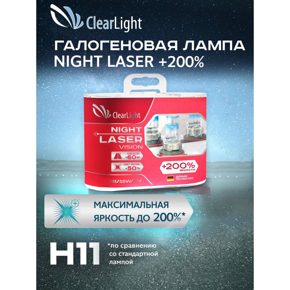 Комплект ламп Clearlight H11, 12 В, 55 Вт, Night Laser Vision +200% Light, 2 шт. MLH11NLV200