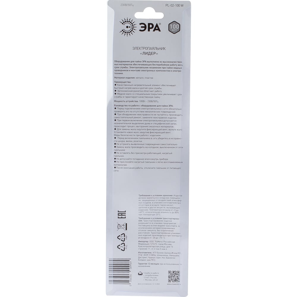 Паяльник ЭРА Лидер с двухкомпонентной рукояткой, жало Long life, 230 В, 100 Вт PL02100 W Б0046950