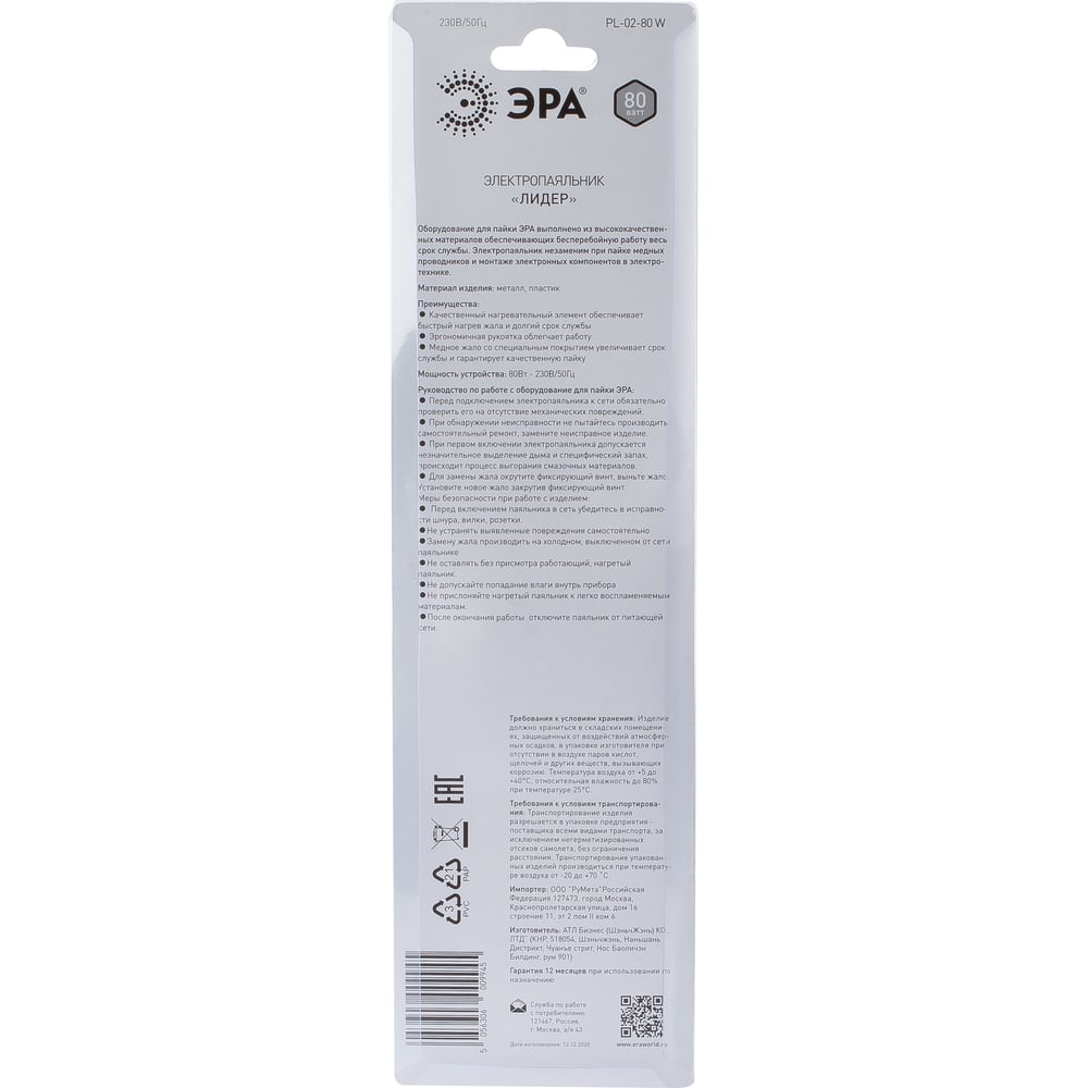 Паяльник ЭРА Лидер с двухкомпонентной рукояткой, жало Long life, 230 В, 80 Вт PL0280 W Б0046949