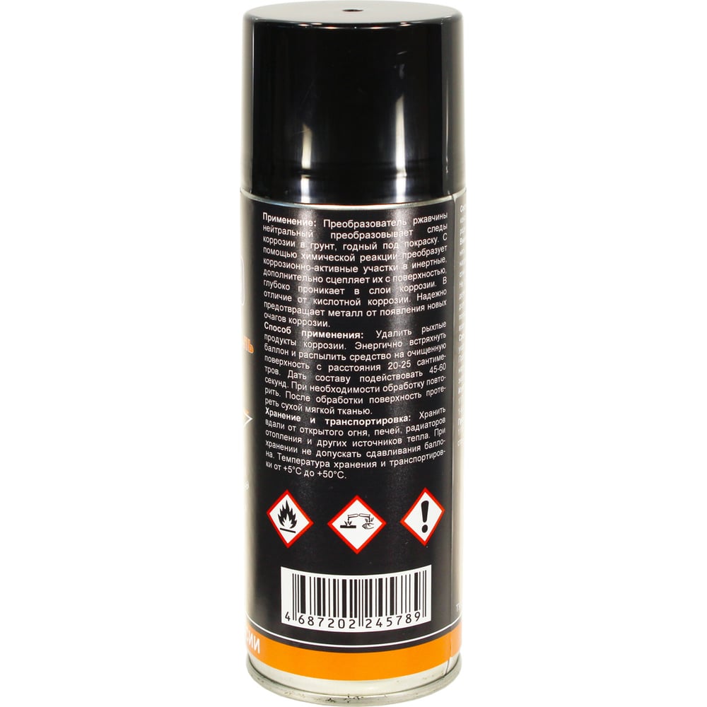 Объем 0.5 л Вид преобразователь ржавчины Вес нетто 0.364 кг Без запаха нет Состав Вода >30%, функциональные добавки, консервант >5%, озонобезопасный углеводородный пропеллент >20%. Вид тары баллон Марка нет Срок хранения 3 года ГОСТ/ТУ ТУ 20.59.41-00205032878-2017
