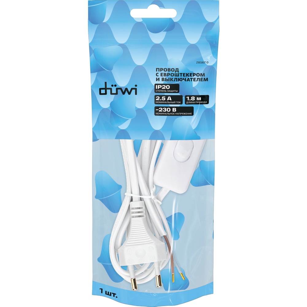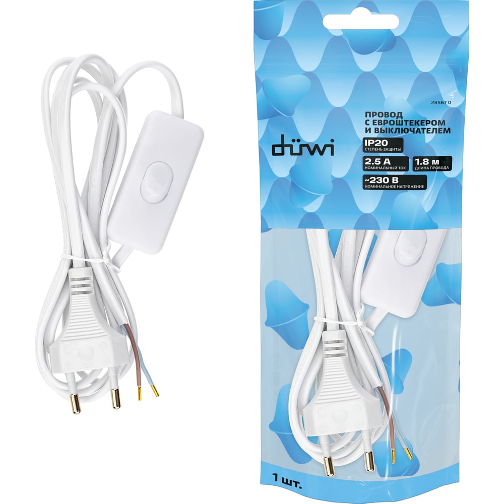 Провод с евроштекером и выключателем duwi белый 1,8м H 03 VV-F 2x0,5 мм 28567 0