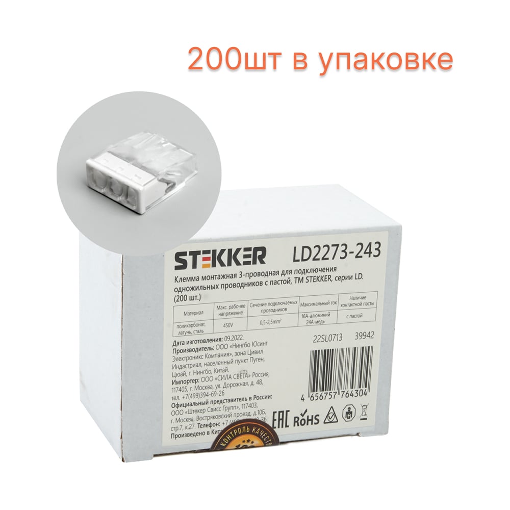 Монтажная 3-проводная клемма STEKKER с пастой для 1-жильного проводника, ld2273-243, 200 шт 39942