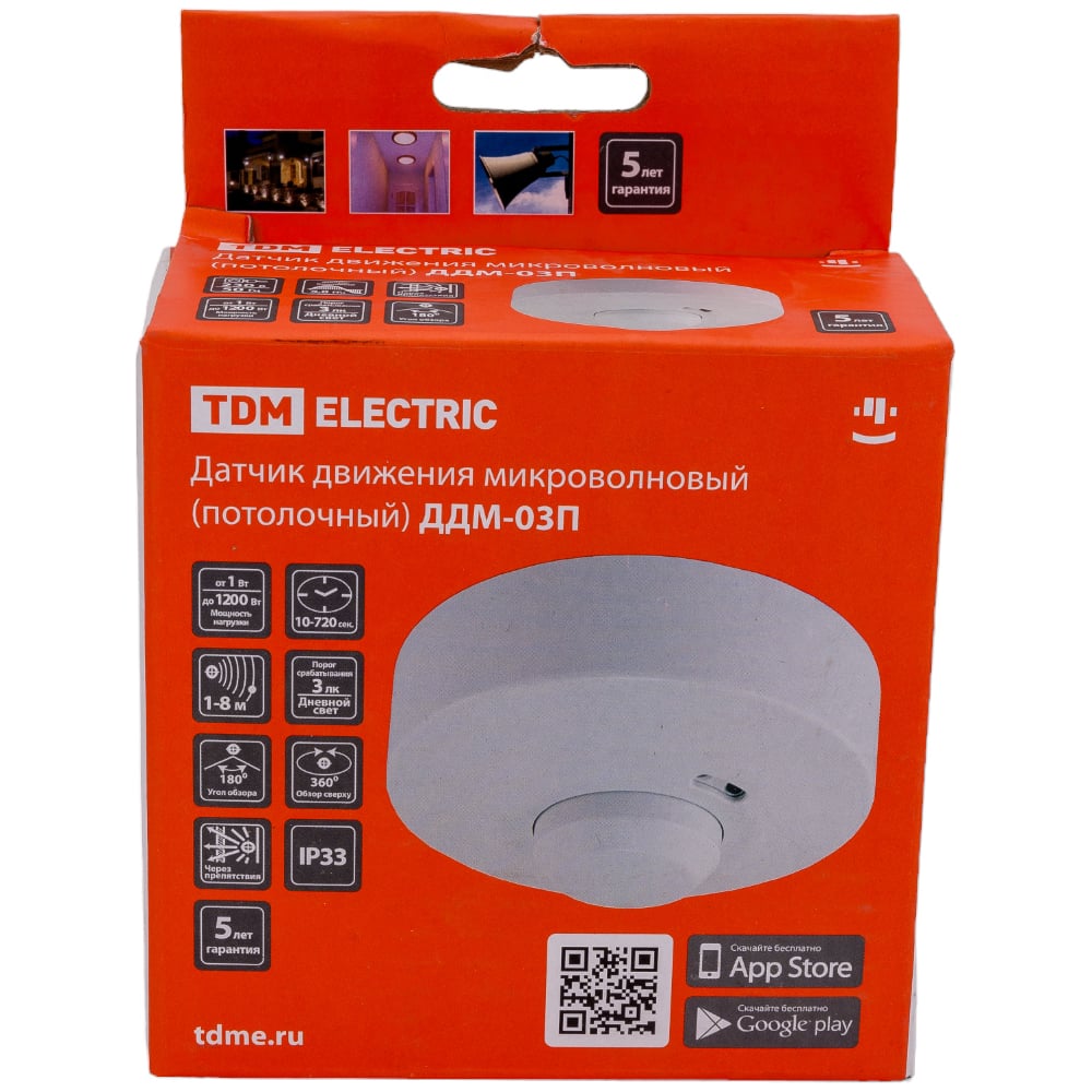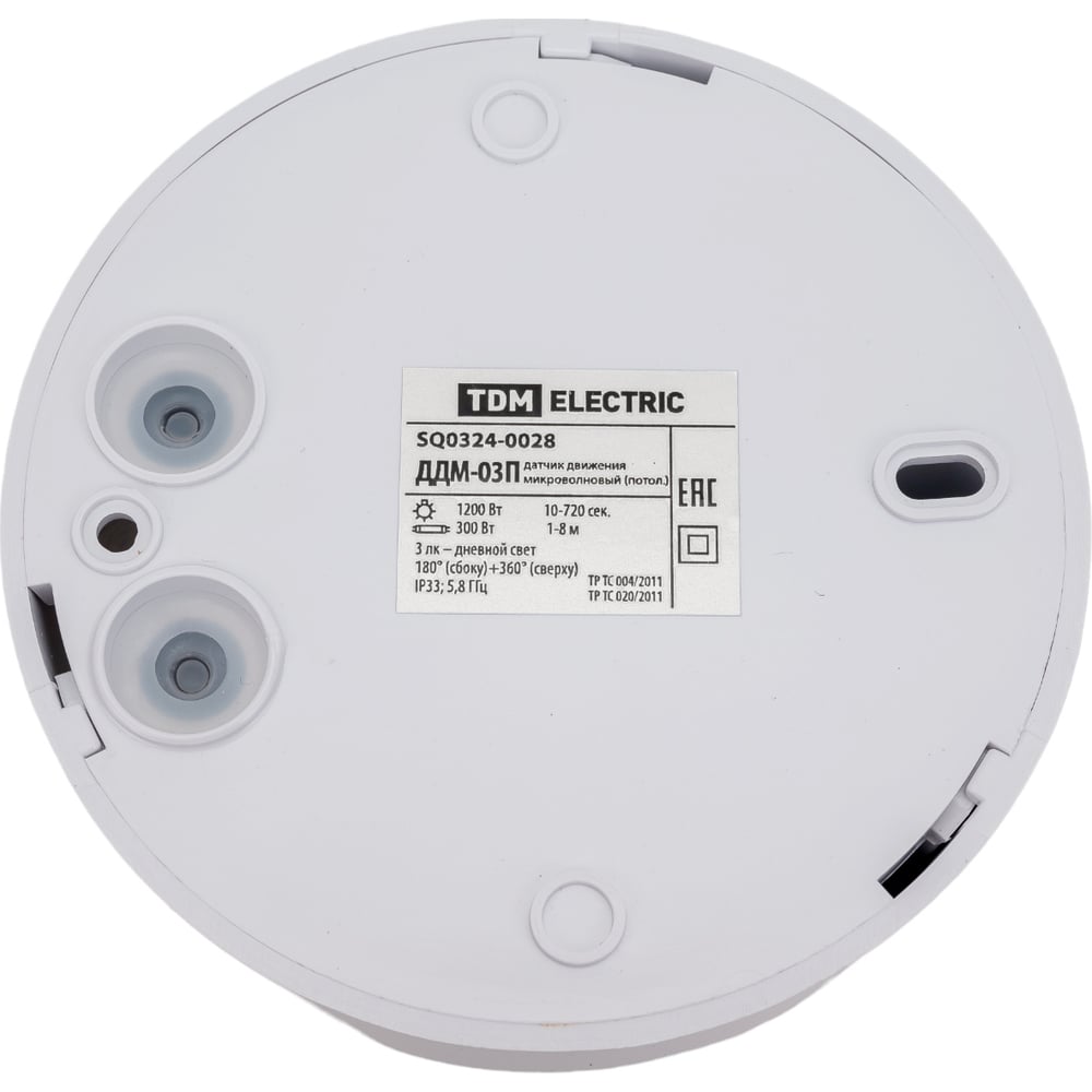 Датчик движения TDM ELECTRIC ДДМ-03П 5,8ГГц, 1200Вт, 10-720с, 1-8м, 3+лк, 180 сбоку+360 сверху гр, IP33 SQ0324-0028
