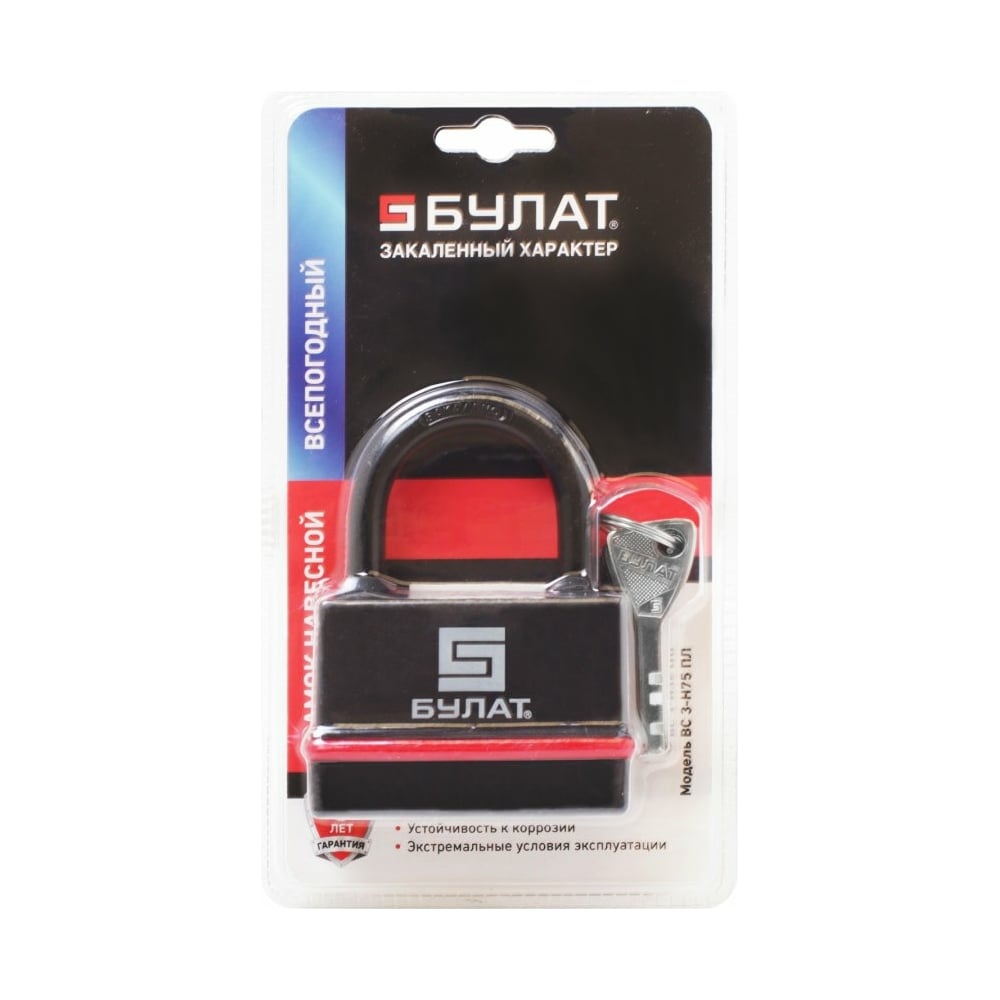 Навесной всепогодный замок БУЛАТ ВС 3-Н75 ПЛ 5 ключей, d=10 мм 13655