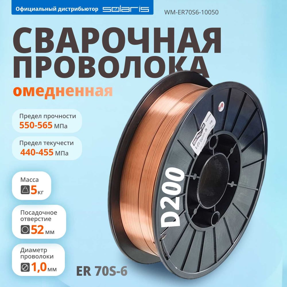 Проволока сварочная омедненная ER 70S-6 (1 мм; катушка D200; 5 кг) SOLARIS WM-ER70S6-10050