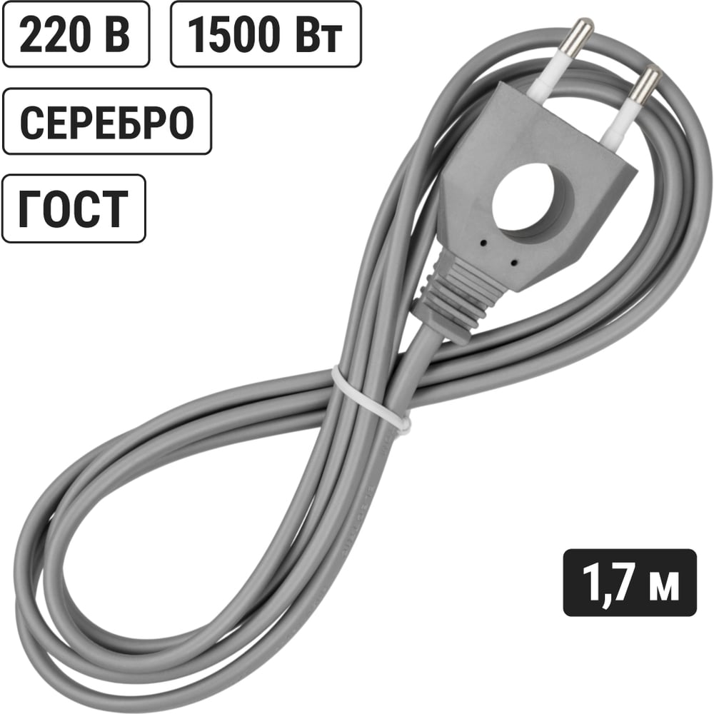 Цвет серебро Тип шнур с вилкой Класс товара Бытовой Вес нетто 0.125 кг Основной материал поливинилхлорид (ПВХ) Степень защиты IP20 Выключатель на корпусе нет Модельный ряд ШУ Световая индикация нет Заземление нет Напряжение сети 230/220 В Номинальная сила тока 6 А Длина кабеля 1.7 м Max нагрузка 1.2 кВт Сечение провода 2х0.75 мм² Max импульсный ток 0.006 кА Max нагрузка (Вт) 1200 Тип провода ШВВП Количество розеток нет шт Тип розетки евро Тип выключателя без выключателя