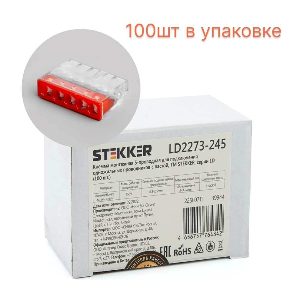 Монтажная 5-проводная клемма STEKKER с пастой для 1-жильного проводника, lLD2273-245, 100 шт 39944
