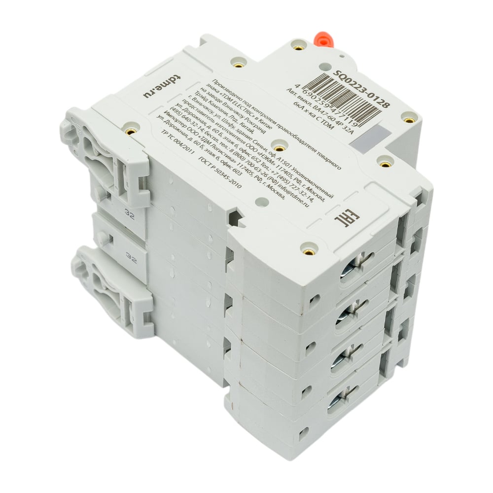 Высота 81 мм Ширина 70 мм Тип модульный Вес нетто 0.376 кг Цвет корпуса белый Тип монтажа на DIN-рейку Степень защиты IP20 ГОСТ ГОСТ 15150-69 Номинальный ток 32 А Номинальное напряжение 230/400 В Модельный ряд ВА47-60 Глубина 73 мм Количество полюсов 4 Климатическое исполнение УХЛ-4 Отключающая способность 6 кА Тип расцепления C Род тока AC(переменный ток)