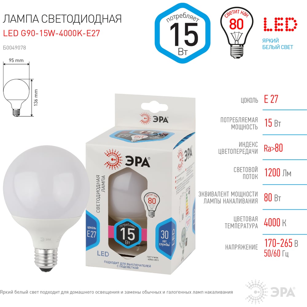 Светодиодная лампа ЭРА LED G90-15W-4000K-E27 диод, шар декор, 15Вт, нейтральный свет Б0049078