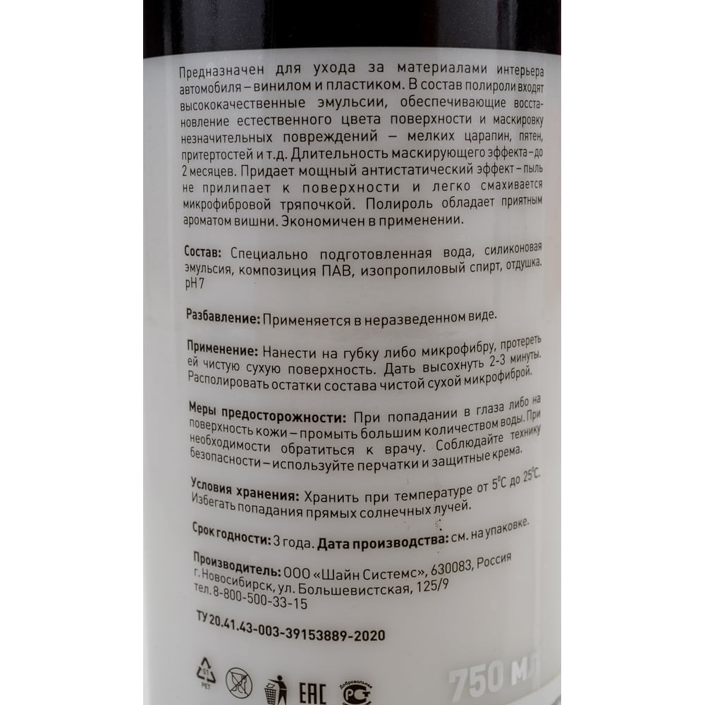Объем 1 л Вид полироль Аромат вишня Класс товара Бытовой Для резины/пластика да Для сплавов нет Для кожи нет Для приборной панели да Назначение для ухода за салоном Способ нанесения ручной Вид упаковки бутылка Вид товара жидкость С воском нет Степень абразивности без абразива