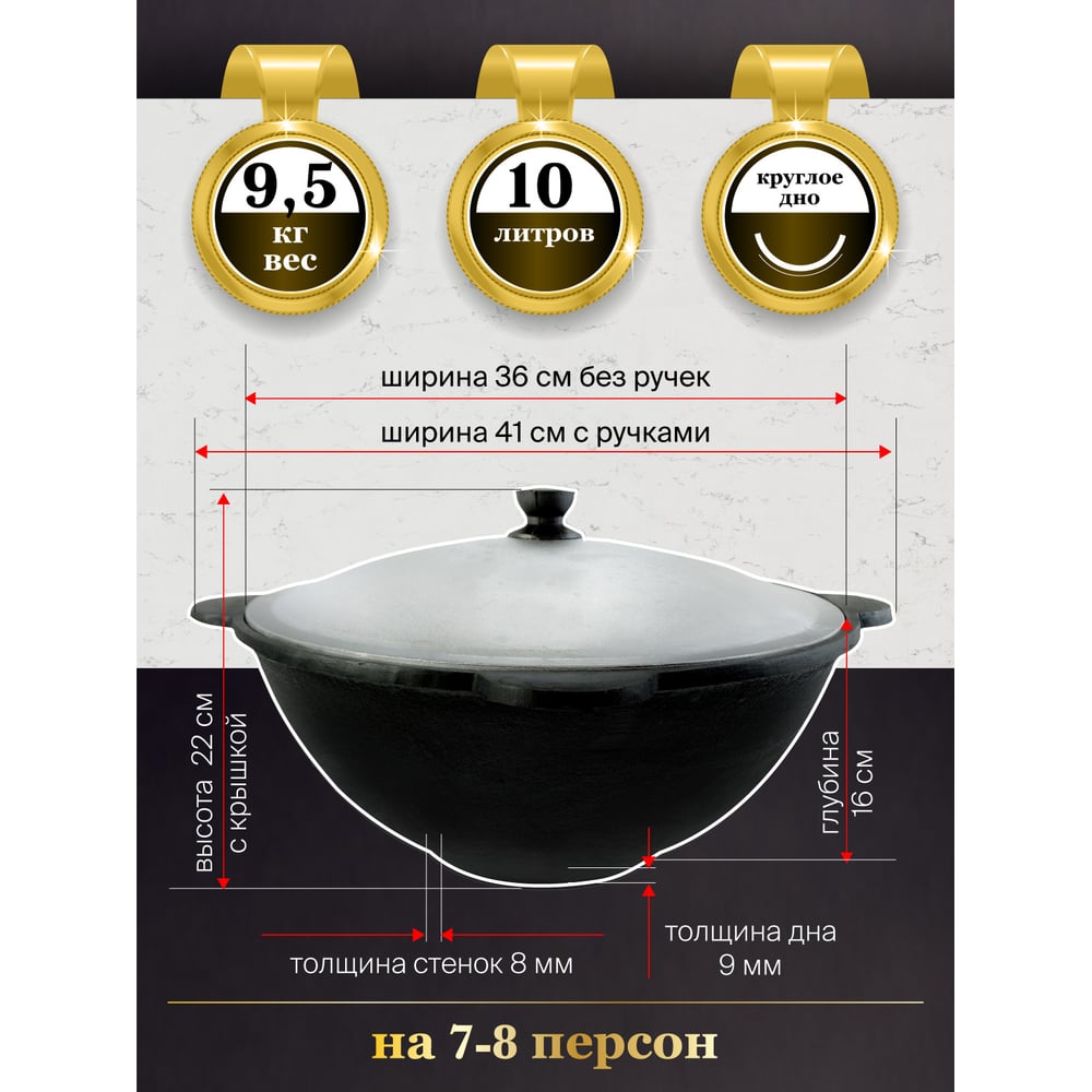 Материал чугун Объем 10 л Вес нетто 9.5 кг Материал крышки алюминий Материал рукояти чугун Тефлоновое покрытие нет Для газовых плит нет Для индукционных плит нет Для электрических плит нет Мойка в посудомоечной машине нет Антипригарное покрытие нет Крышка в комплекте есть Толщина стенок 8 мм Можно использовать в духовке нет